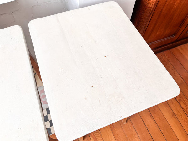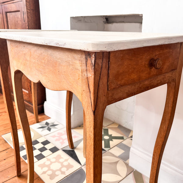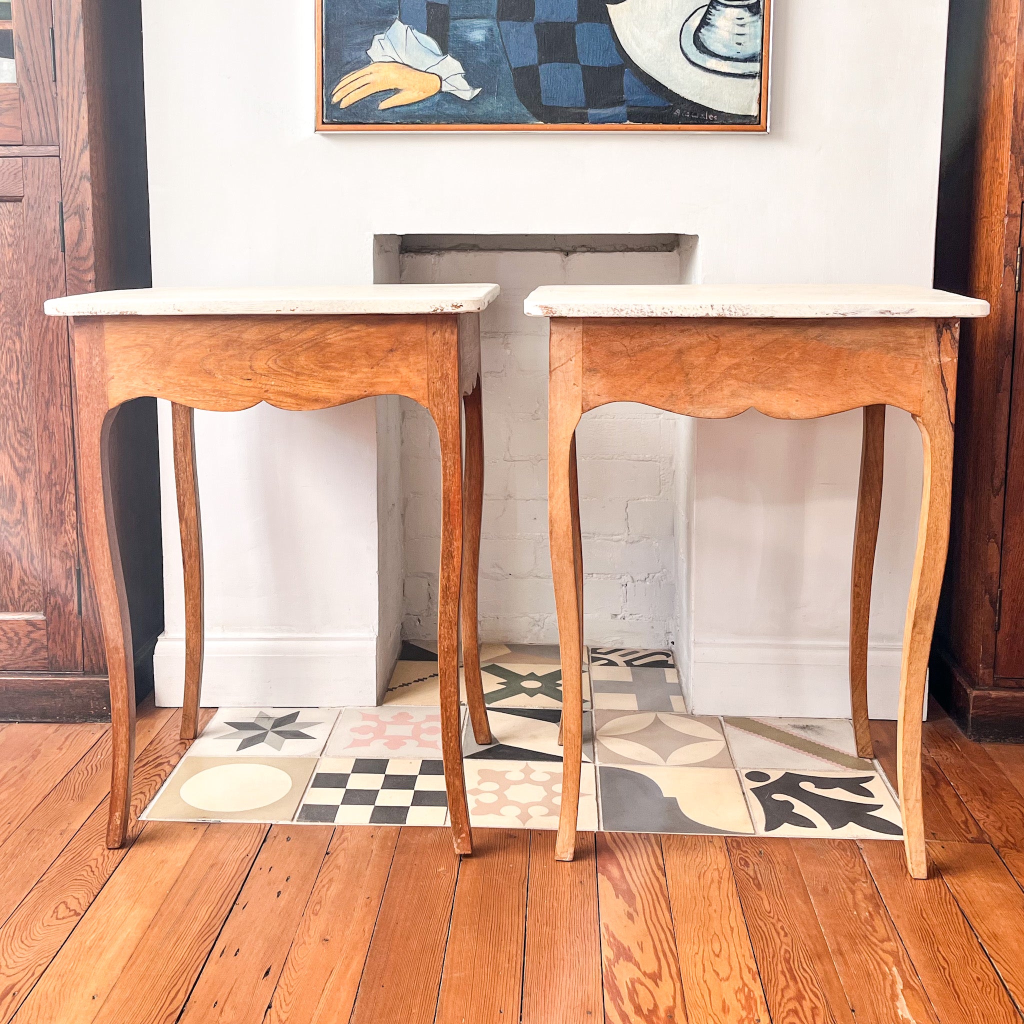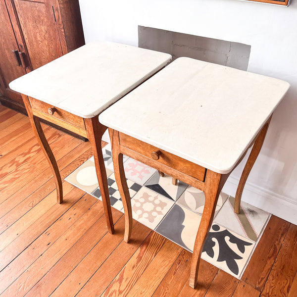 A pair of rather large vintage French side tables with painted table tops. They will make a lovely pair of lamp tables by the side of the sofa. The two drawers will also provide storage space for small items.