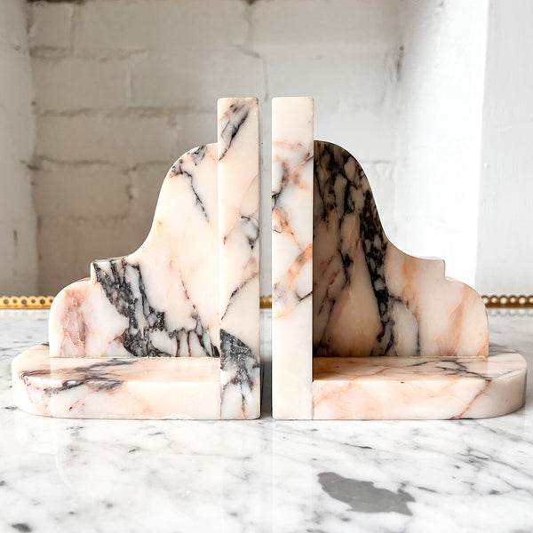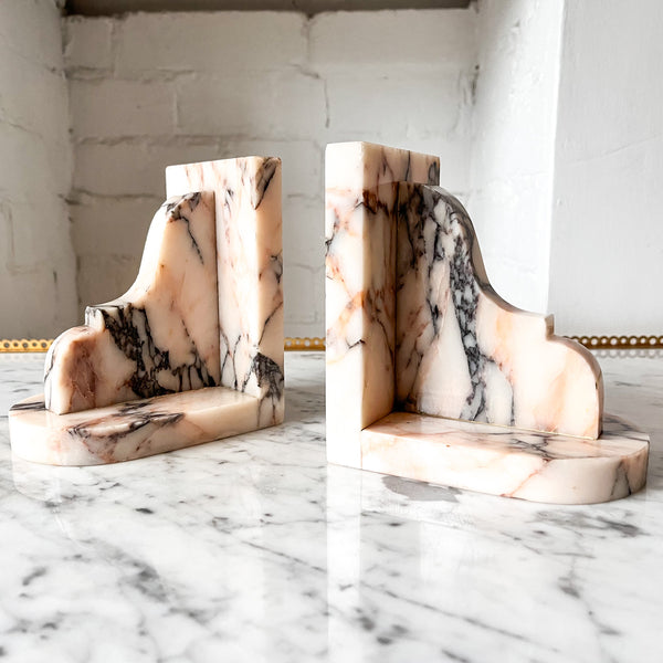 An incredibly beautiful pair of bookends in pink marble with gorgeous dark grey veining.