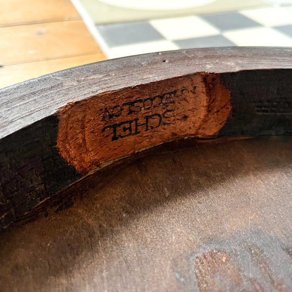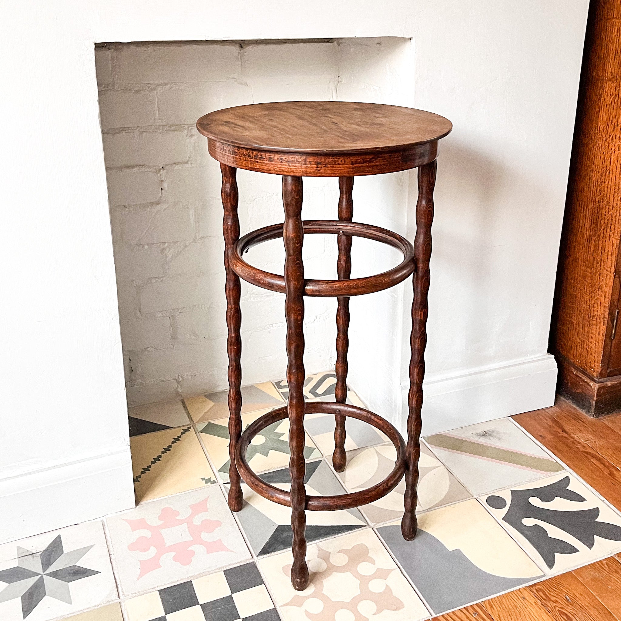 A bentwood side table standing on elegant slender bobbin legs by Fischel. A very unusual and attractive piece. This is the first time I come across a bentwood table with bobbin legs. The shape and size are very versatile and will fit just about anywhere. Fischel maker's label on the underside.