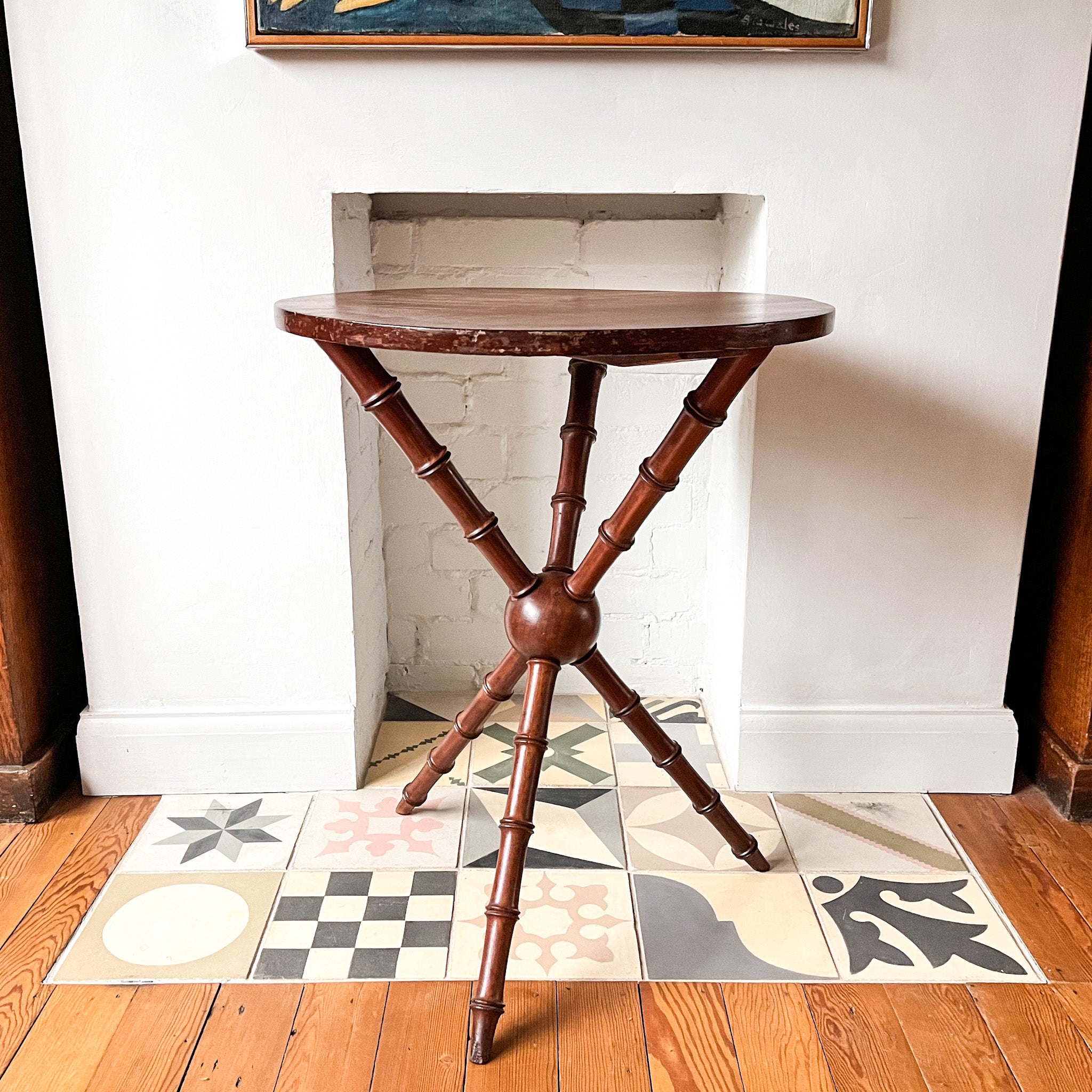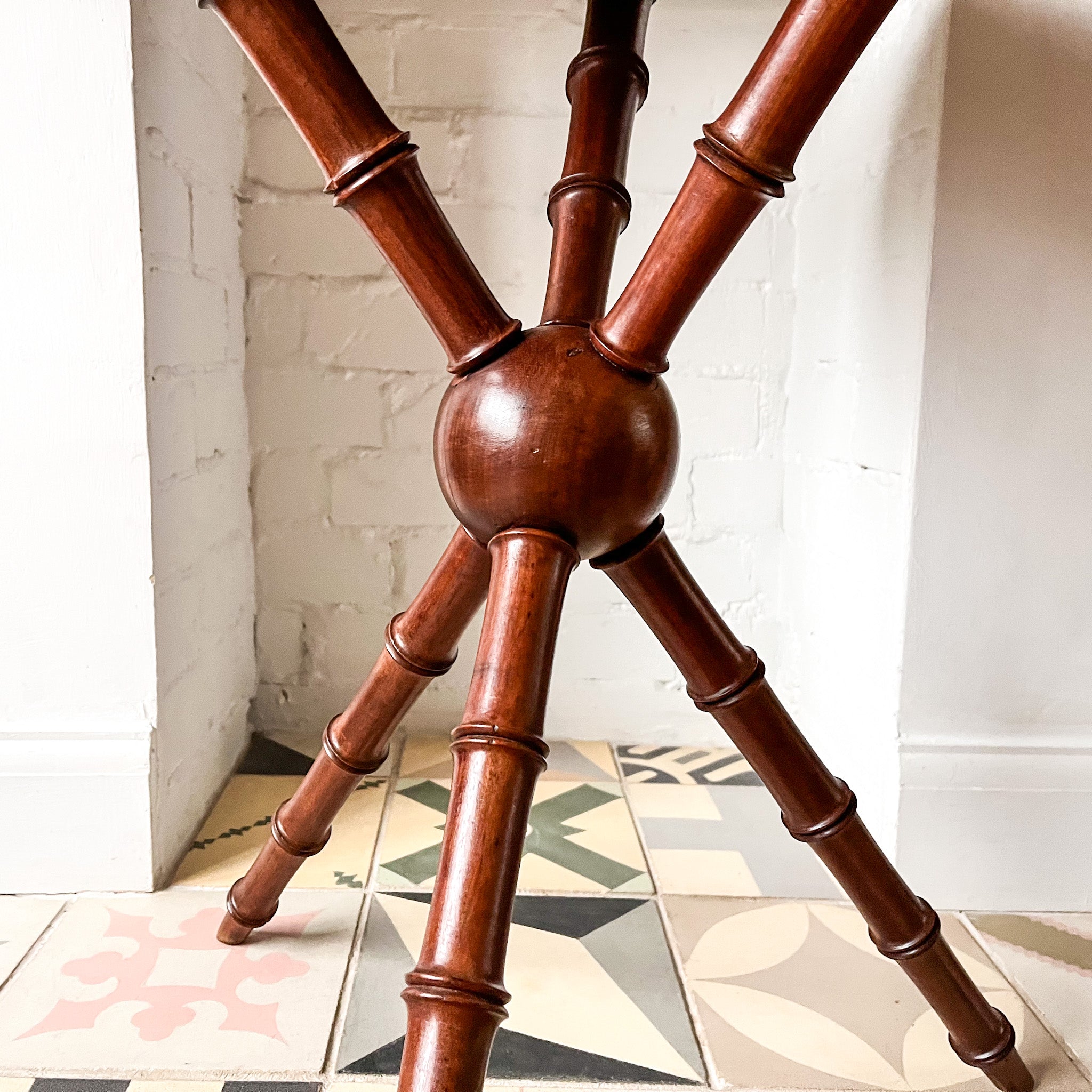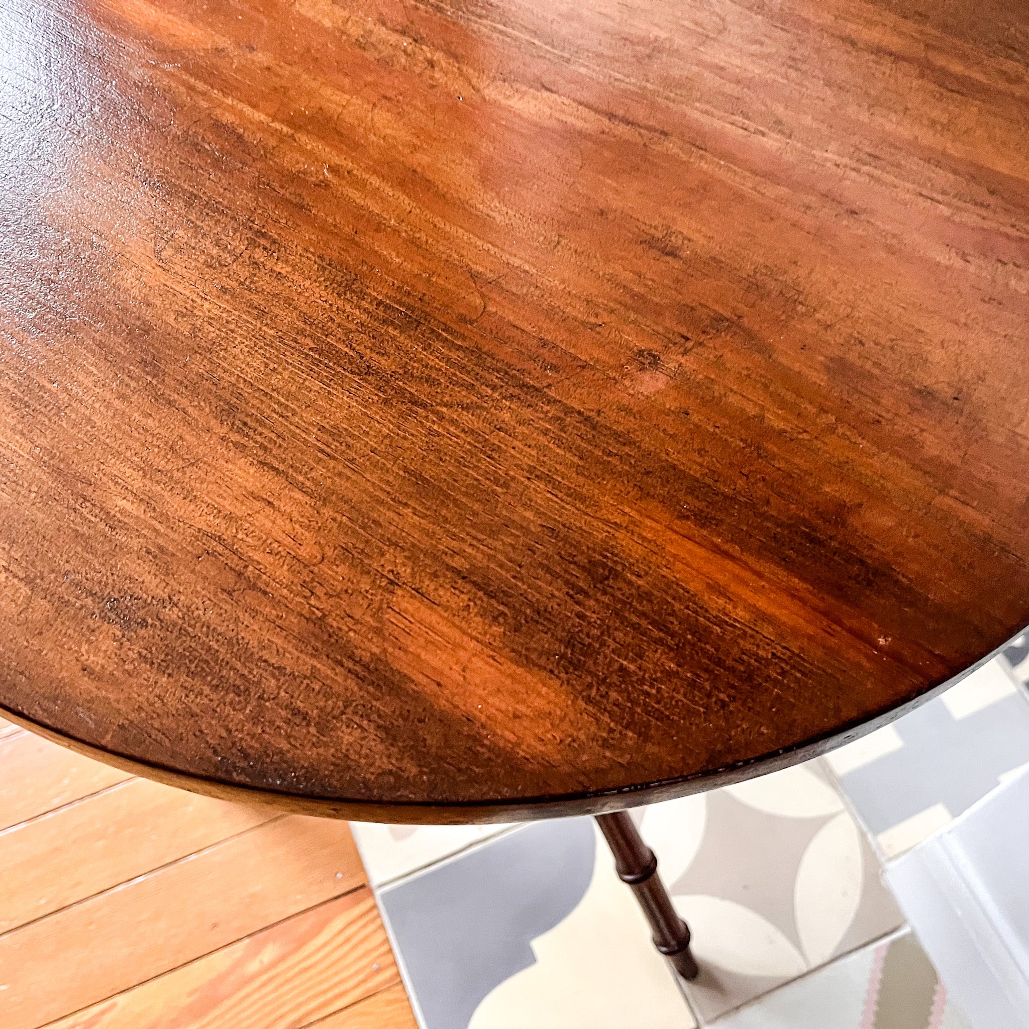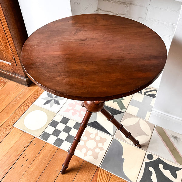 A beautiful round Victorian side table standing on three faux bamboo legs. The legs on this table are very attractive and it's quite rare to find a table of this design. It will make a great side table or lamp table in the corner of a room.