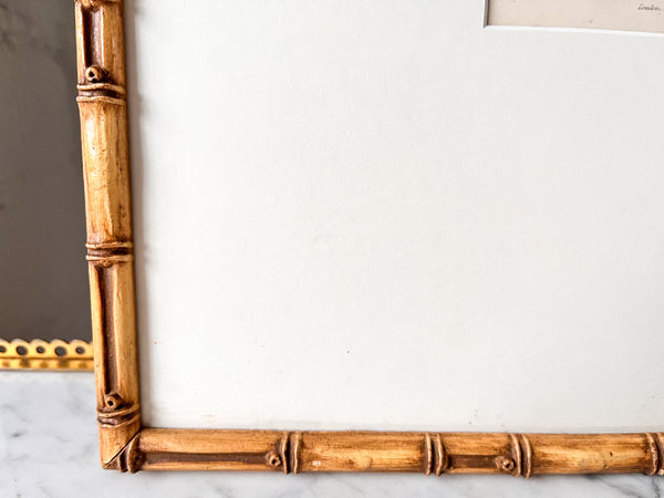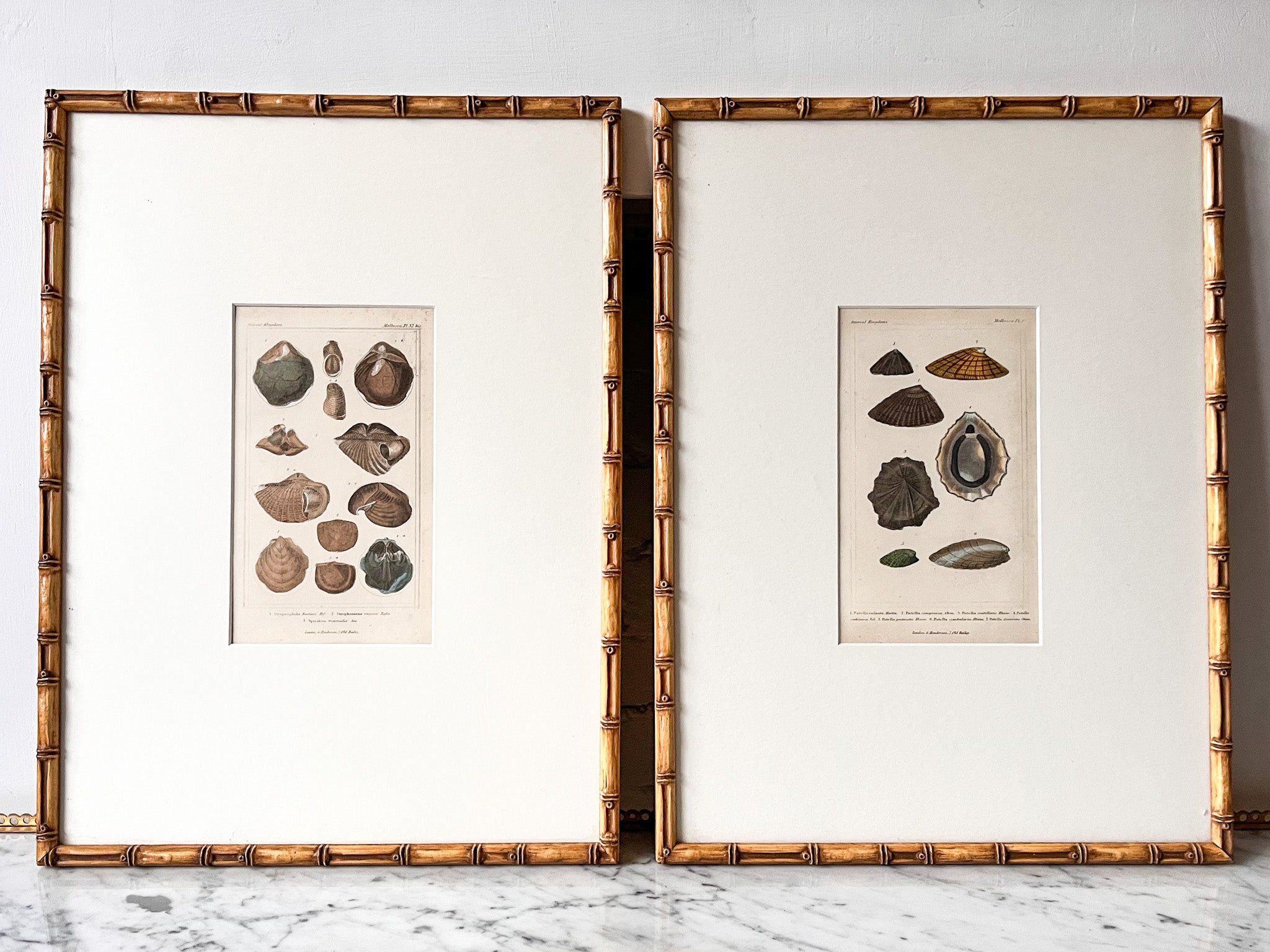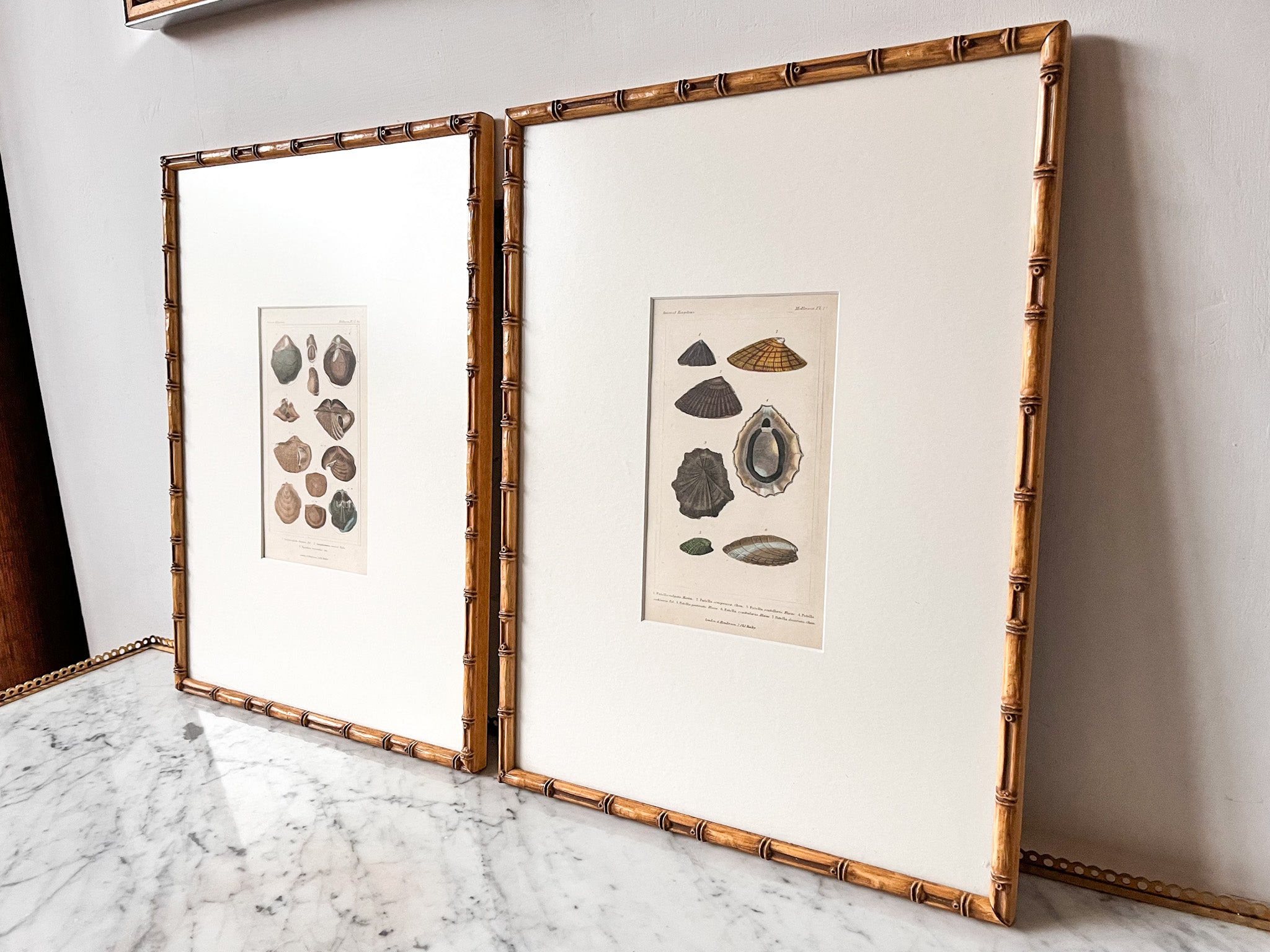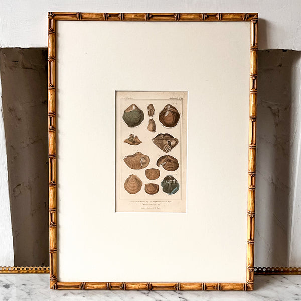 A beautiful antique print depicting shells and sea life in a vintage faux bamboo frame.