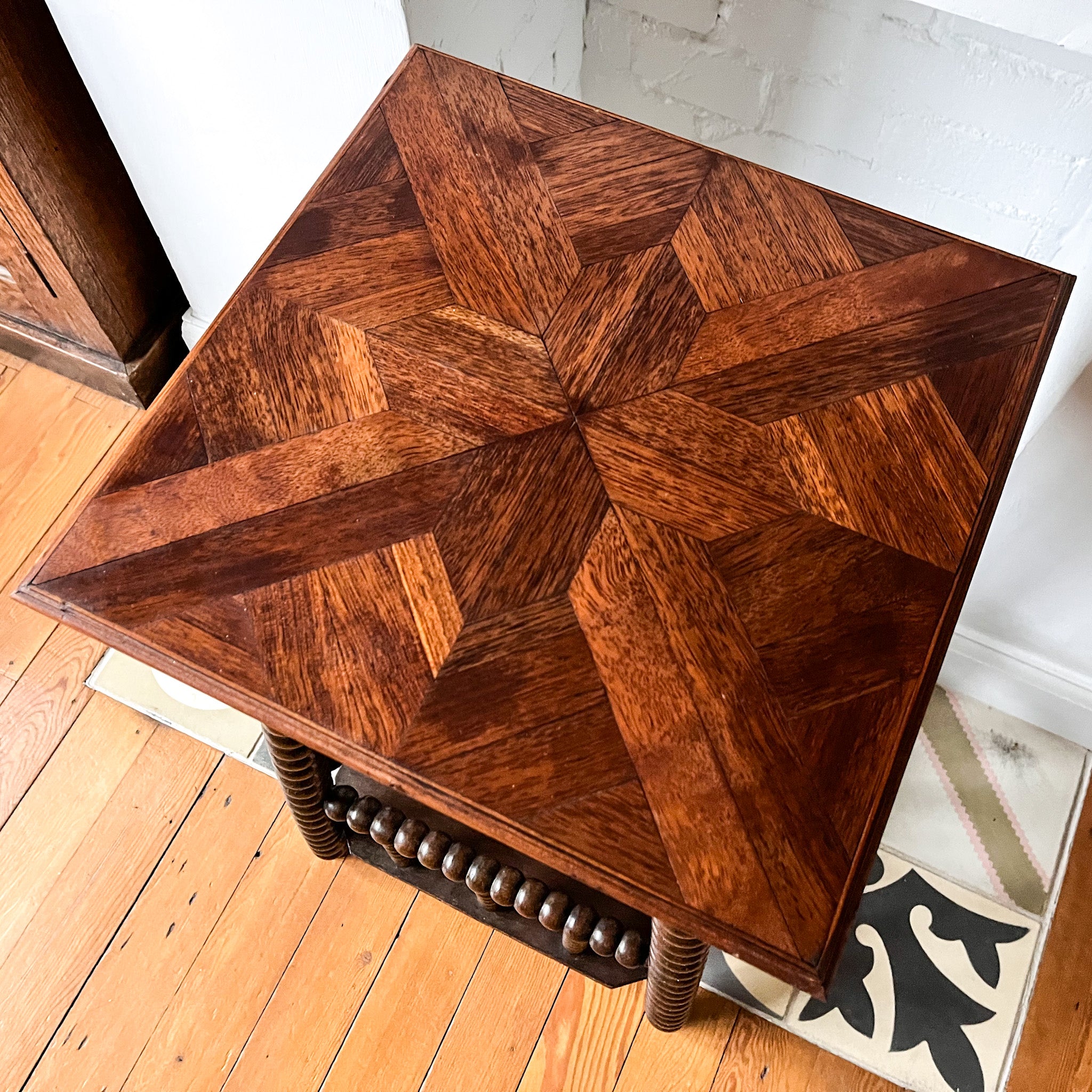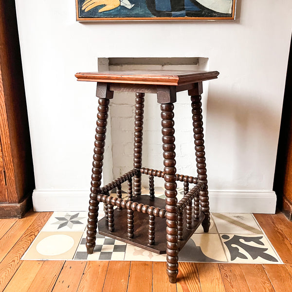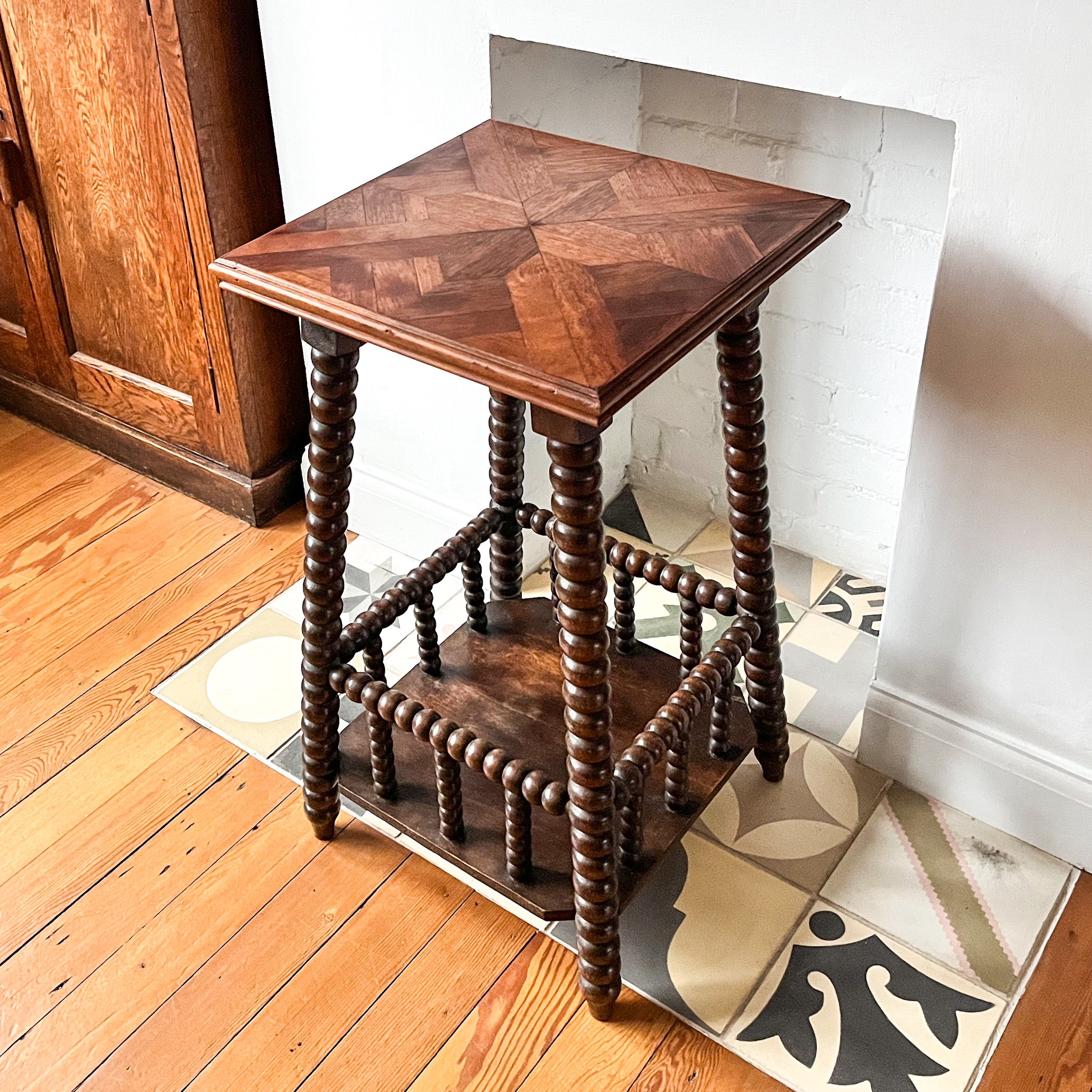 A beautiful French antique two tier bobbin side table with a parquetry top. A perfect side table for bedroom, hallway or bathroom.
