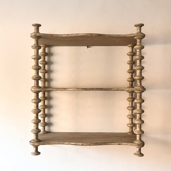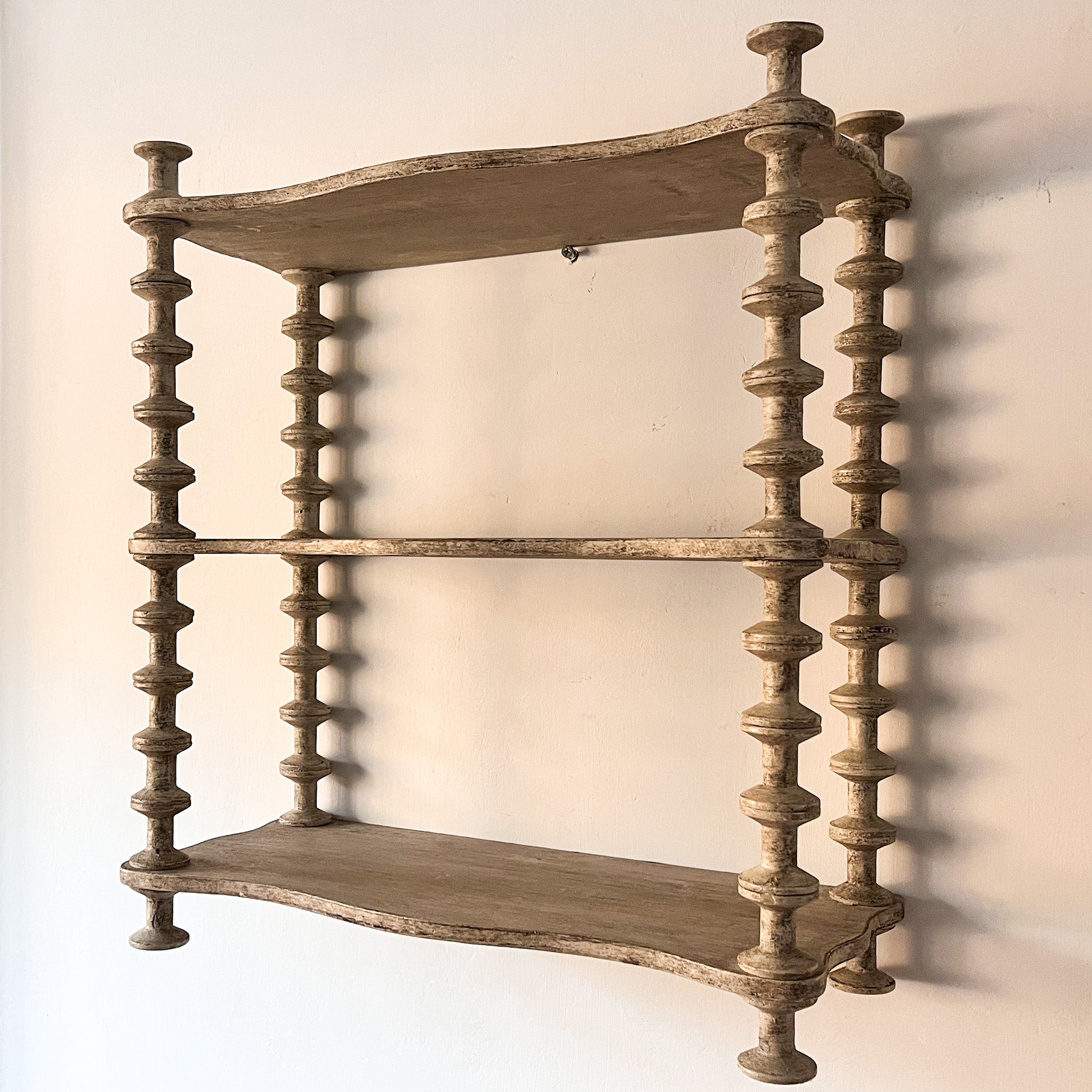 A charming vintage French spindle wall shelf painted grey. It will look lovely in a bathroom, hallway or a kitchen.