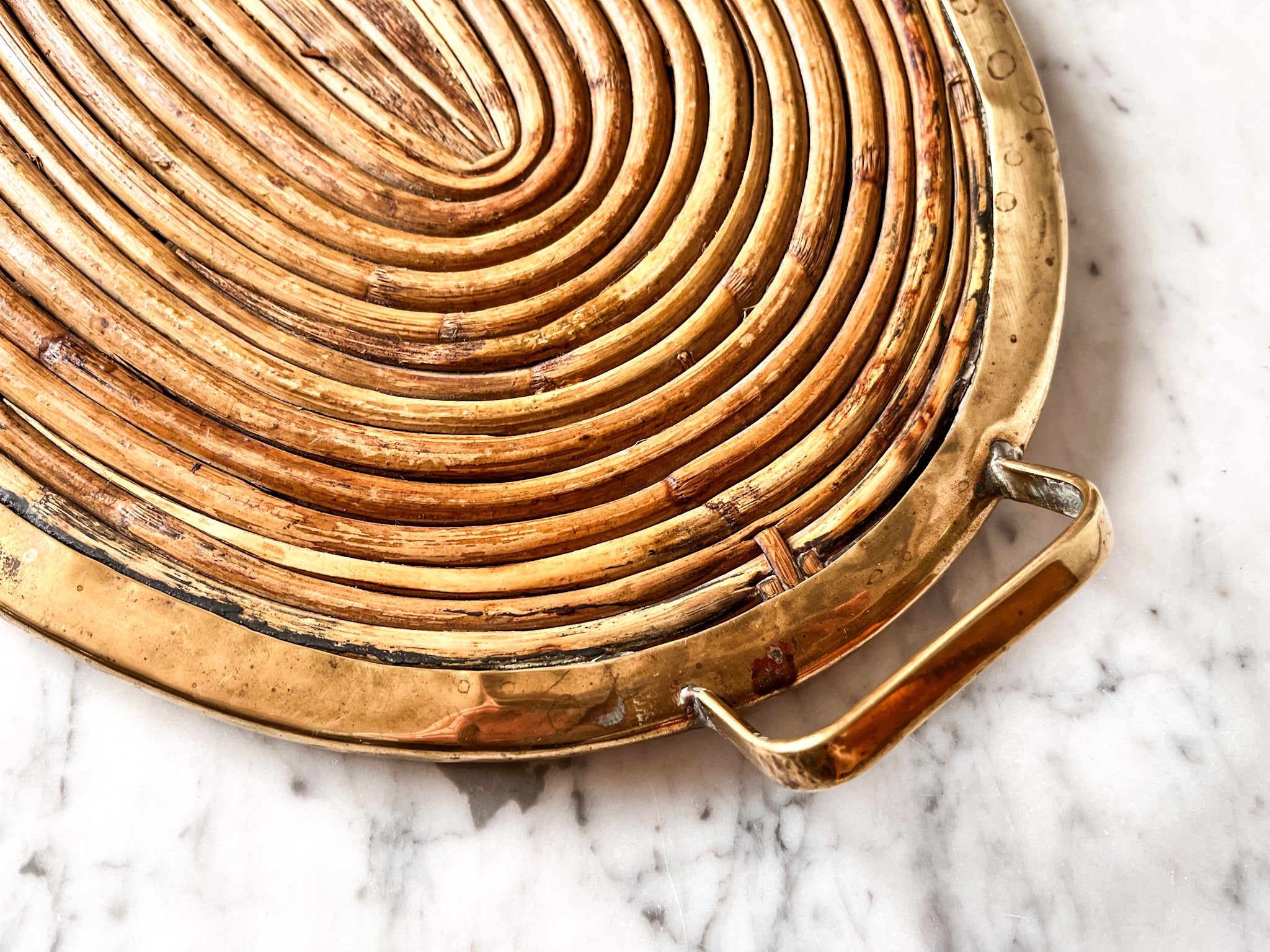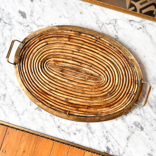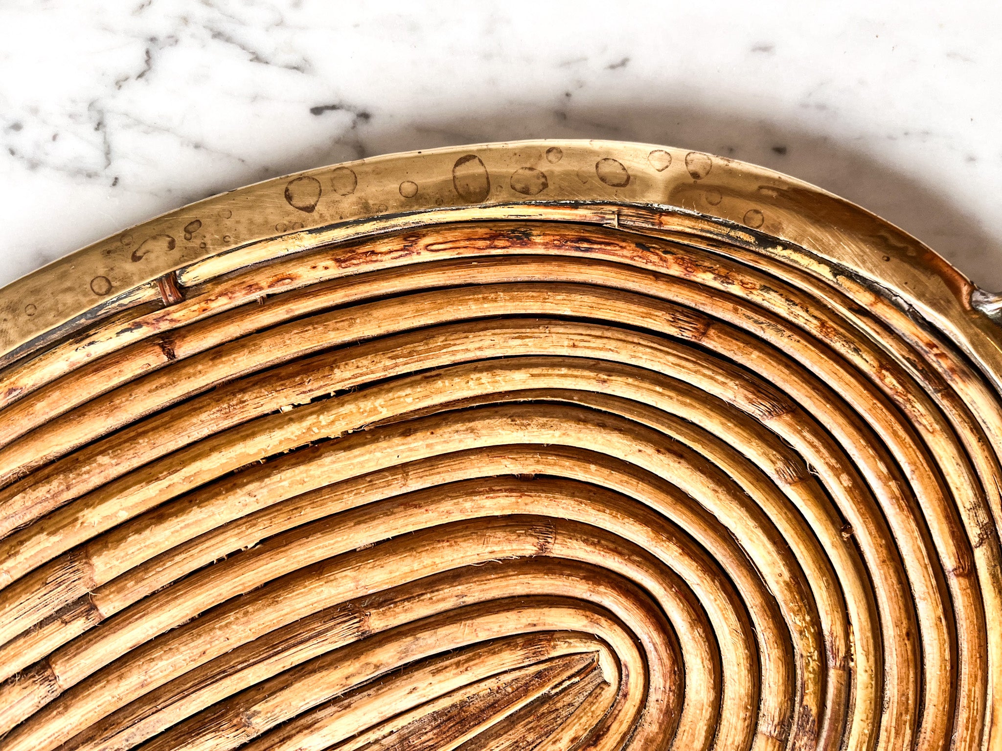 An oval Gabriella Crespi style vintage pencil reed tray with brass trim and handles. Will look great on a coffee table or a sideboard.