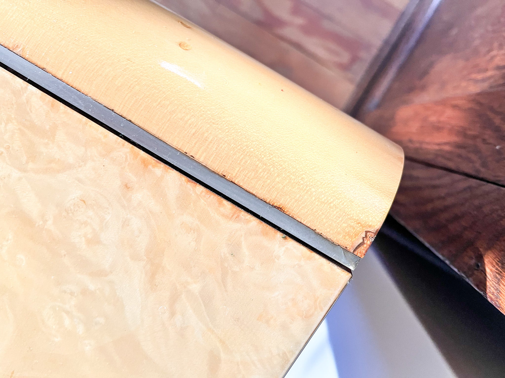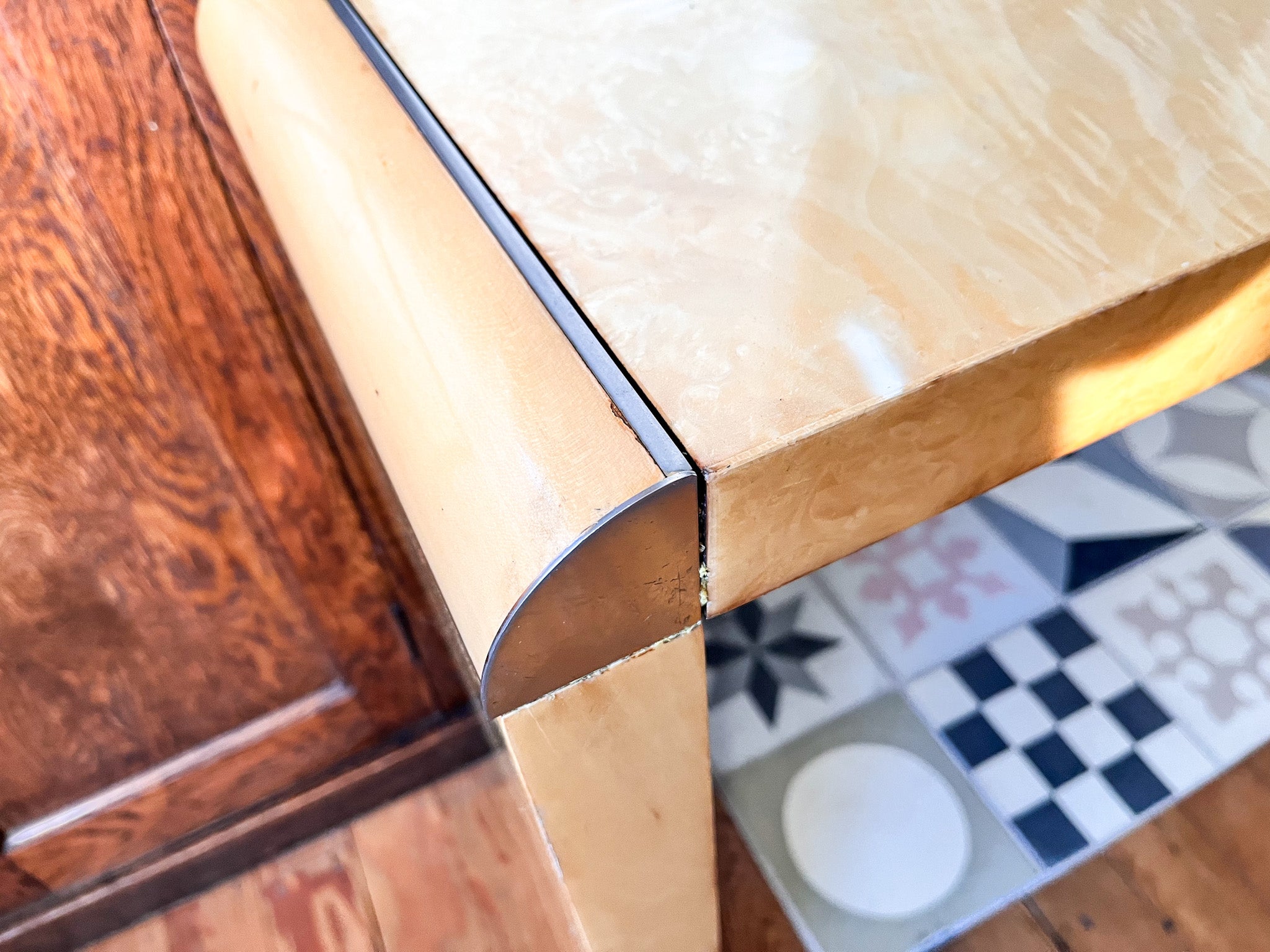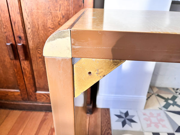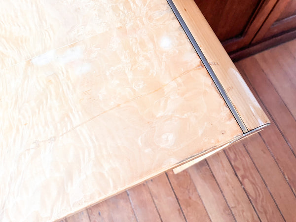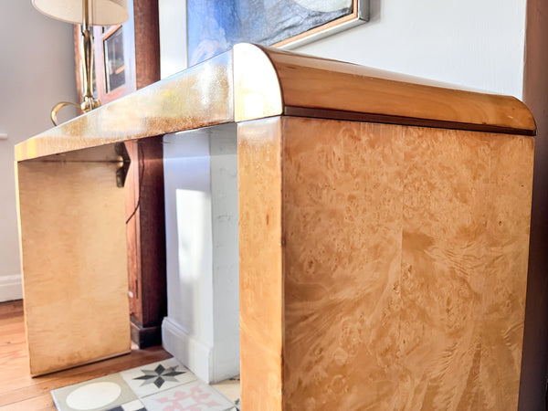 An Italian Art Deco style burl wood console table circa 1980s. The table is rather long and slim making it perfect for creating a very impressive hallway. Very beautiful lacquered blond wood finish with metal detailing and impressive minimalist shape.