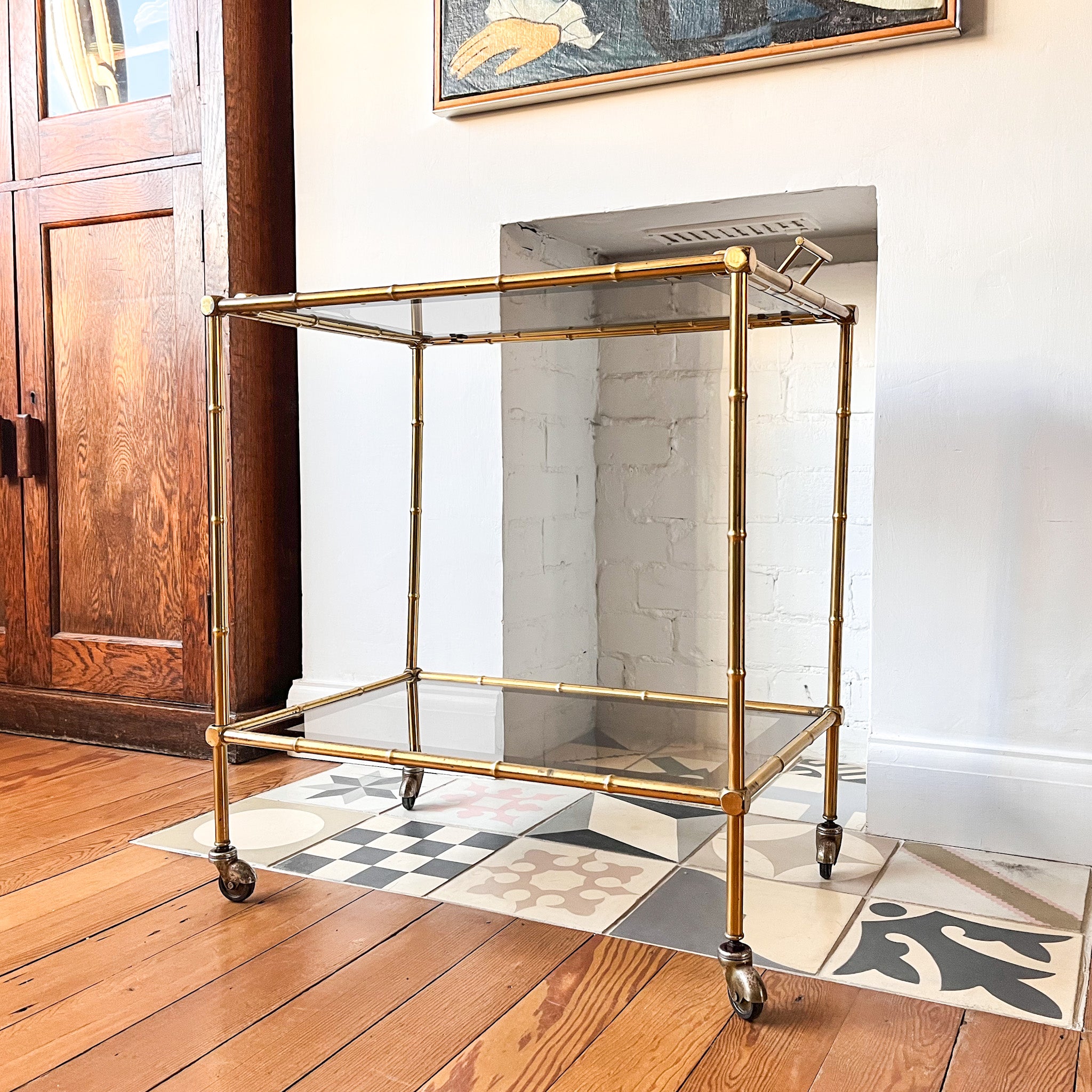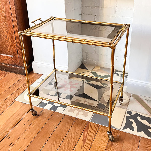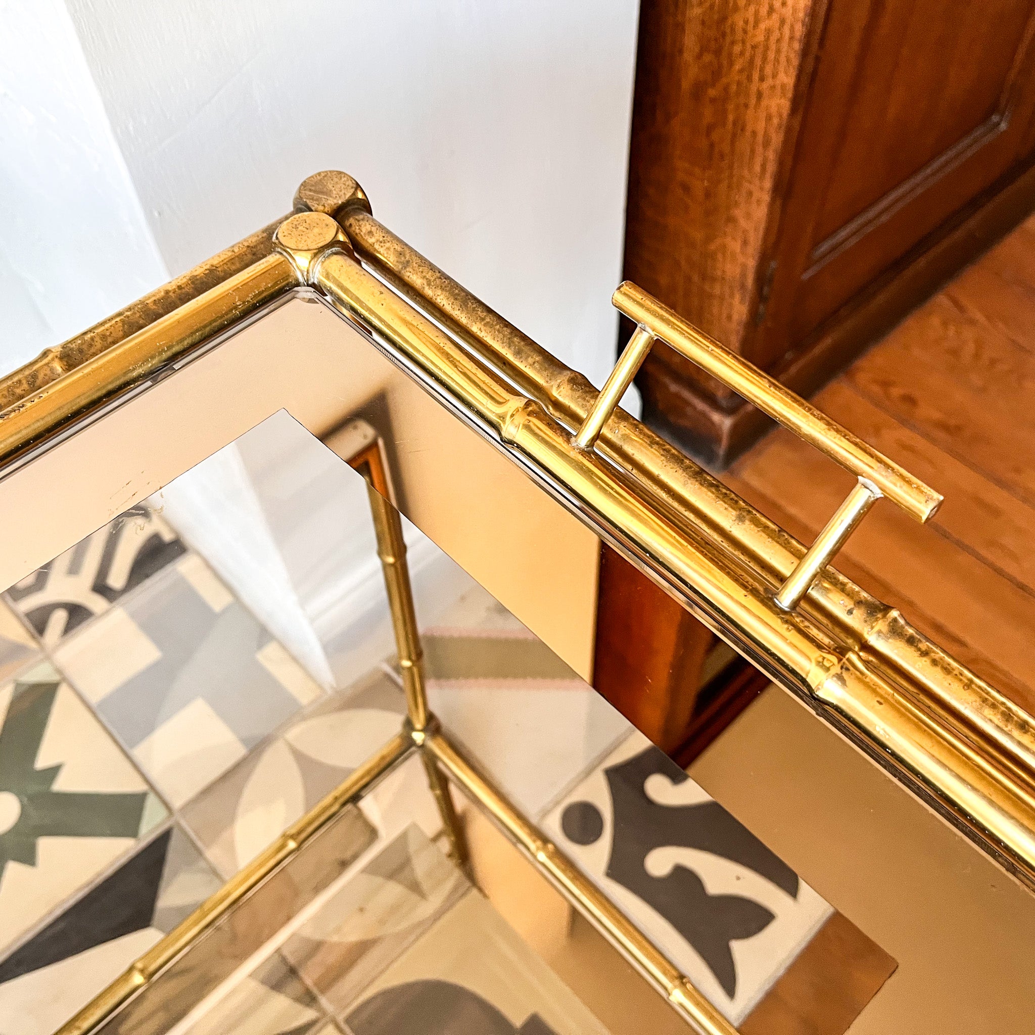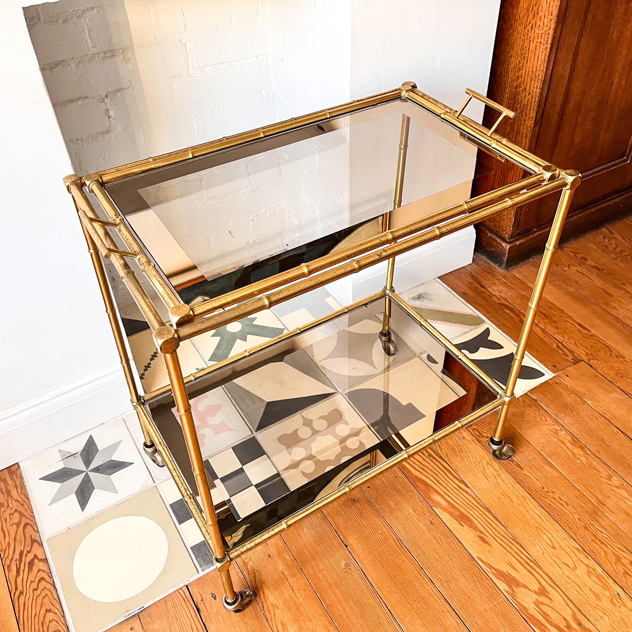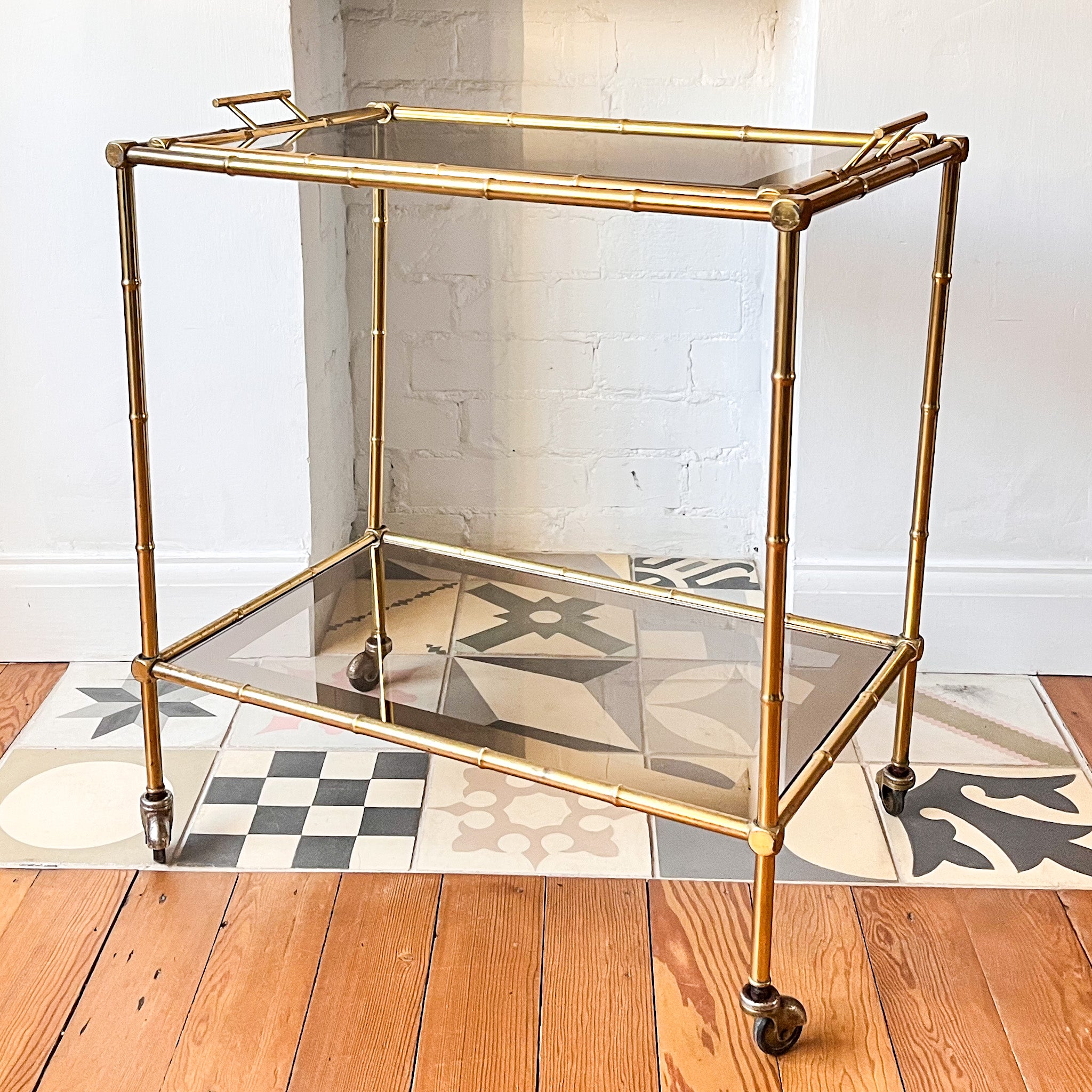 A stunning Italian mid century brass faux bamboo drinks trolley with smoked glass and mirrored tops. Perfect for creating a glamorous drinks station. The top tray is removable and can be used separately for serving drinks for example.