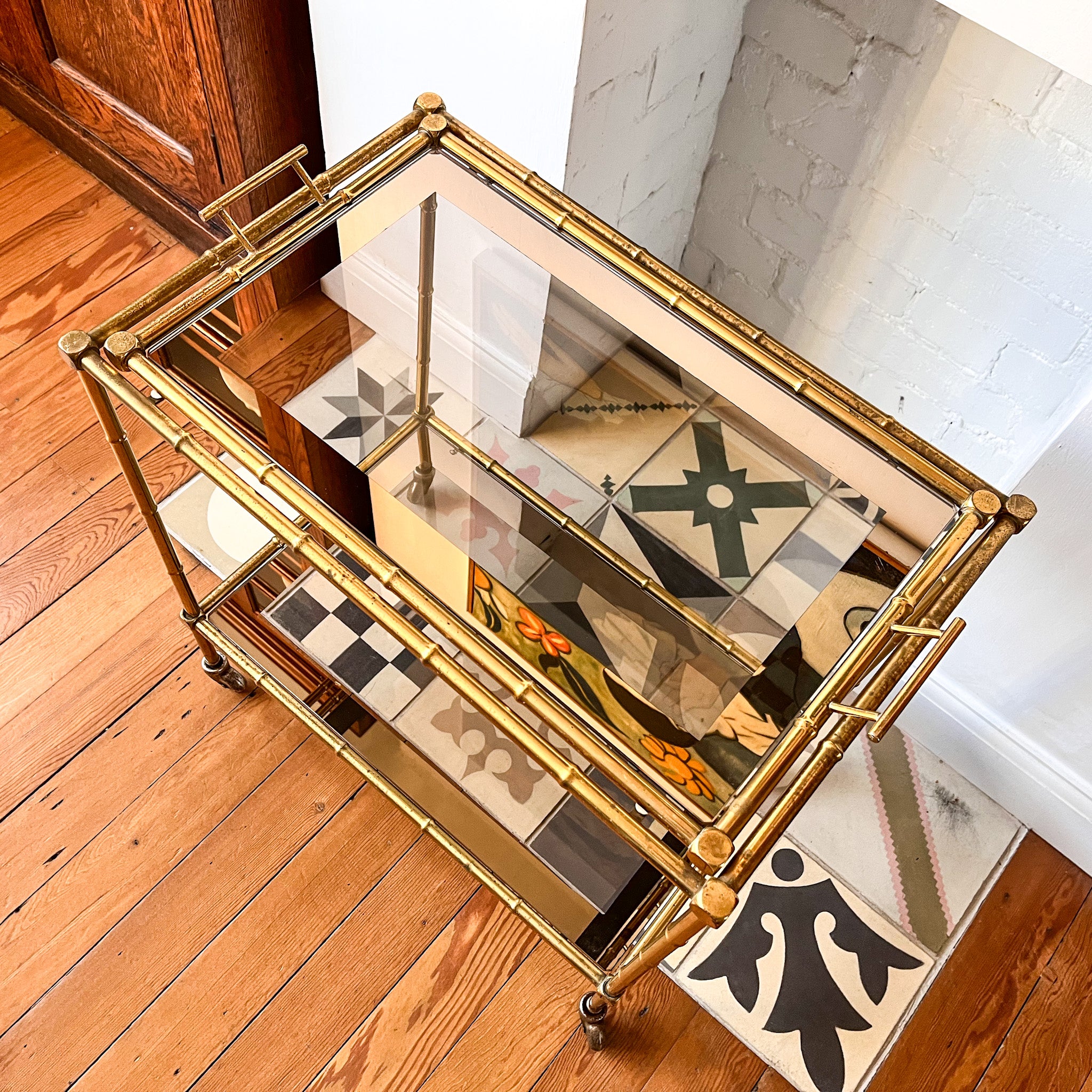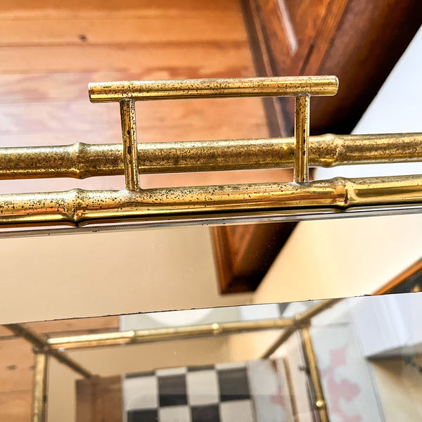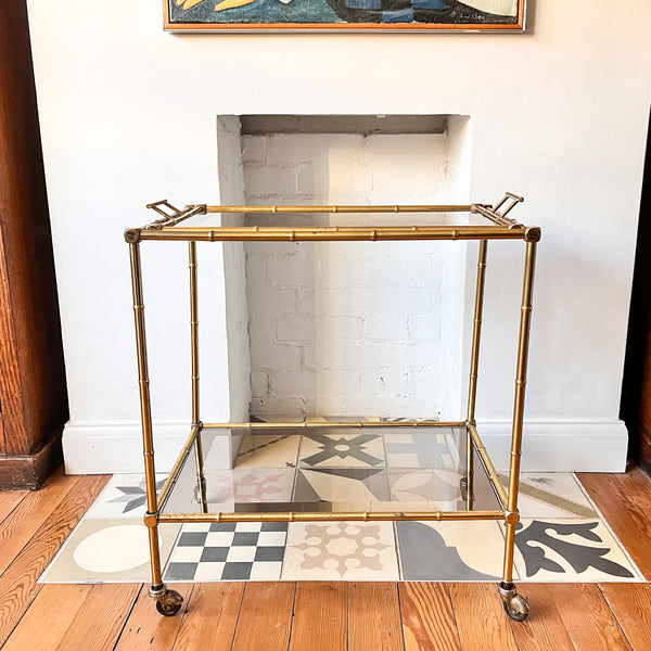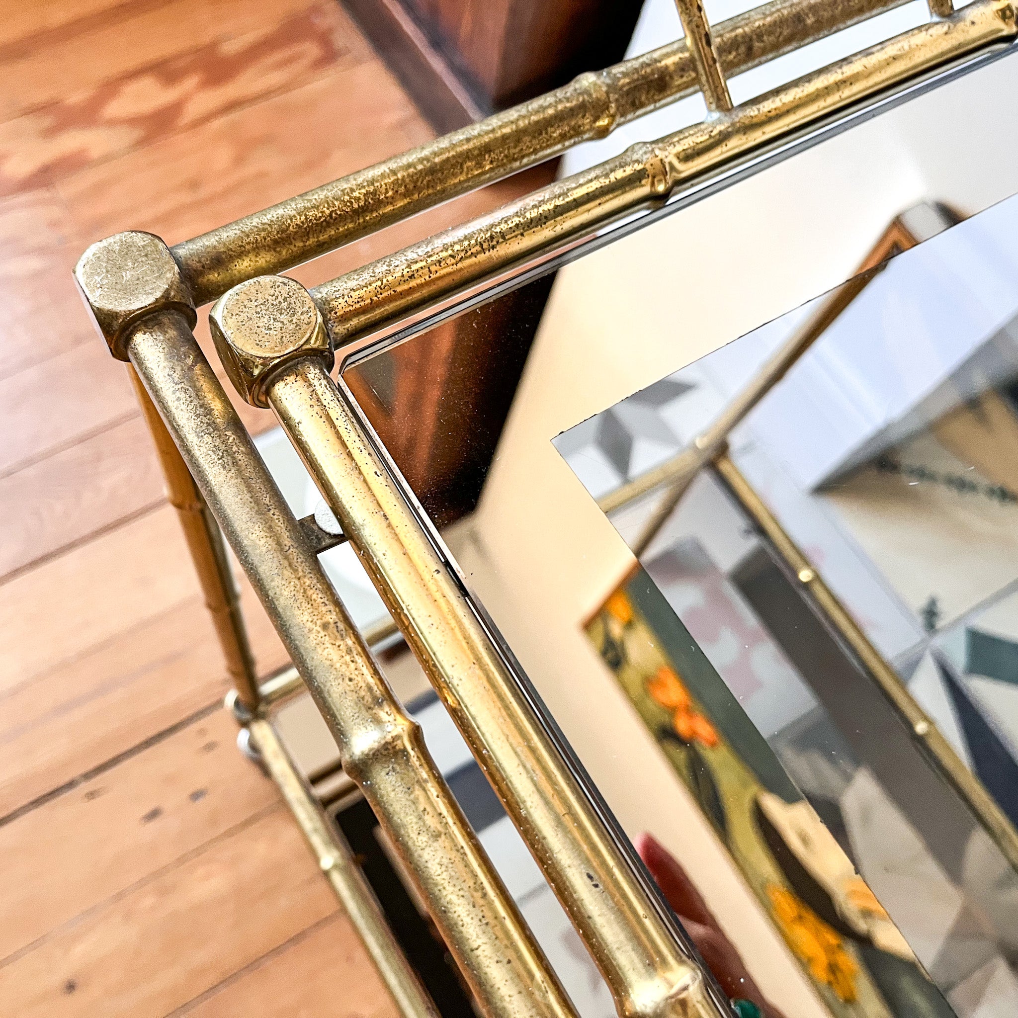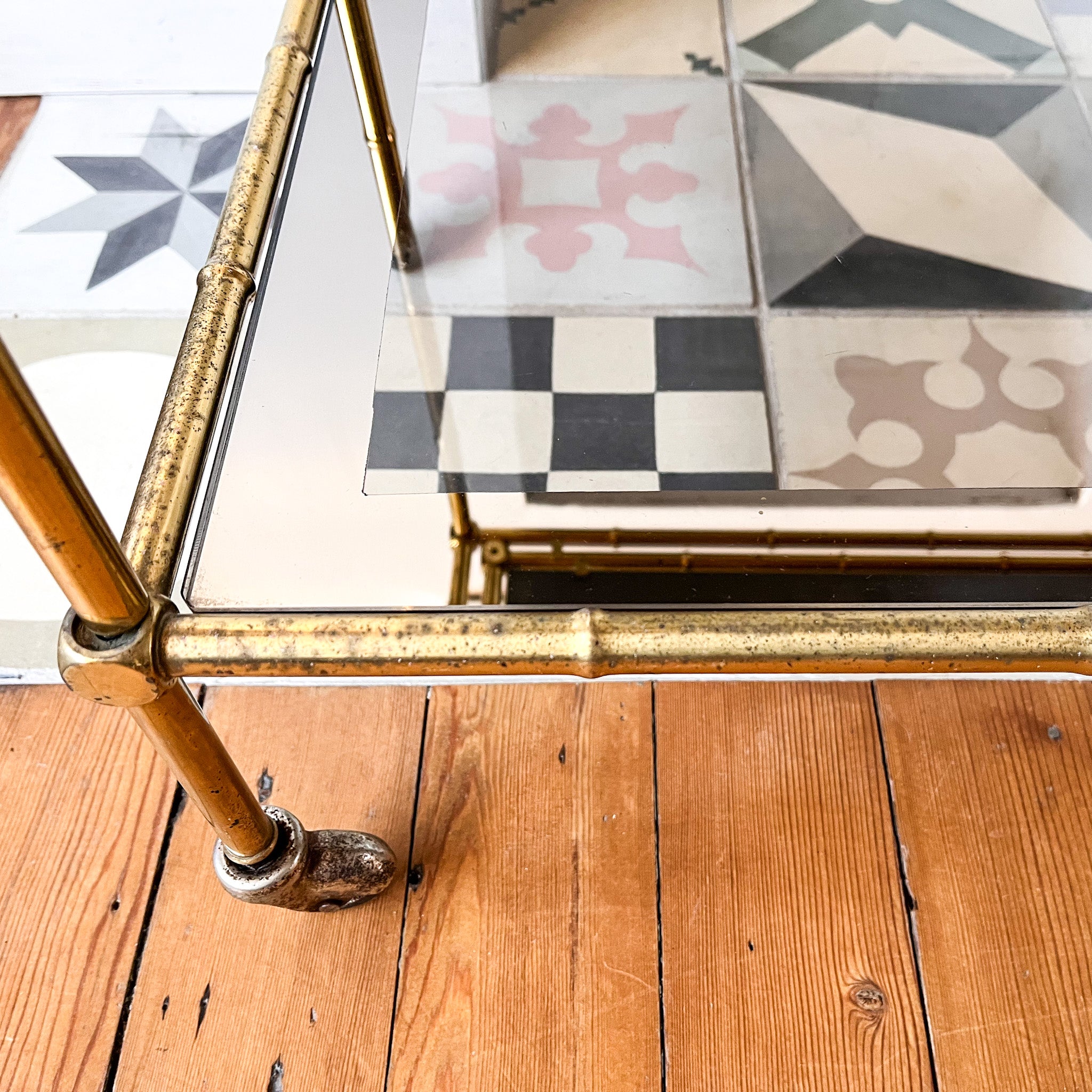 A stunning Italian mid century brass faux bamboo drinks trolley with smoked glass and mirrored tops. Perfect for creating a glamorous drinks station. The top tray is removable and can be used separately for serving drinks for example.