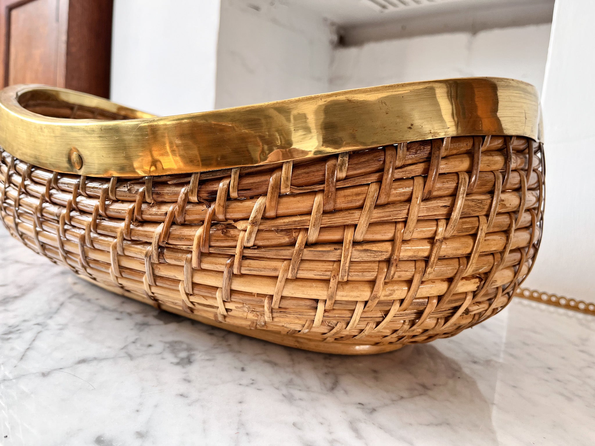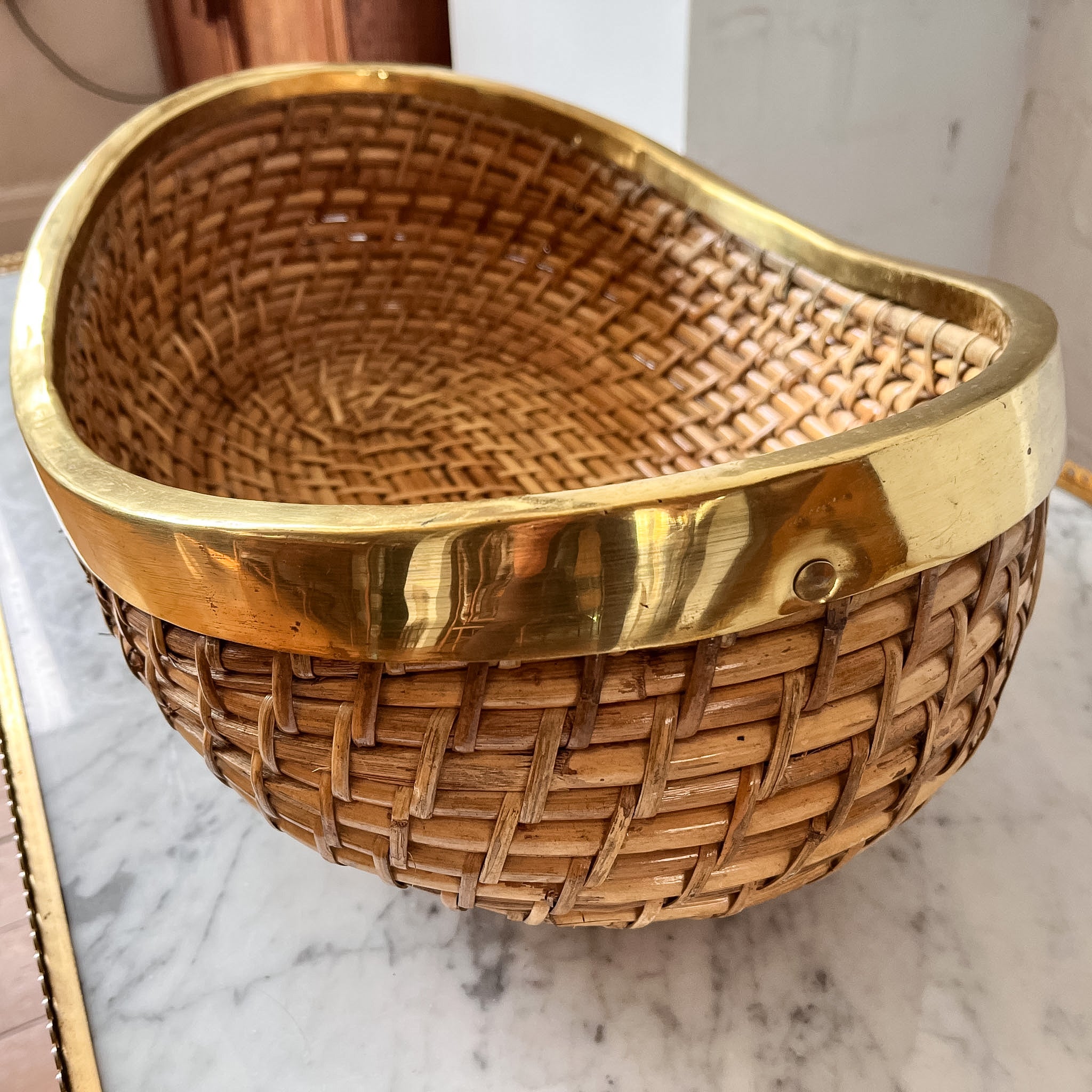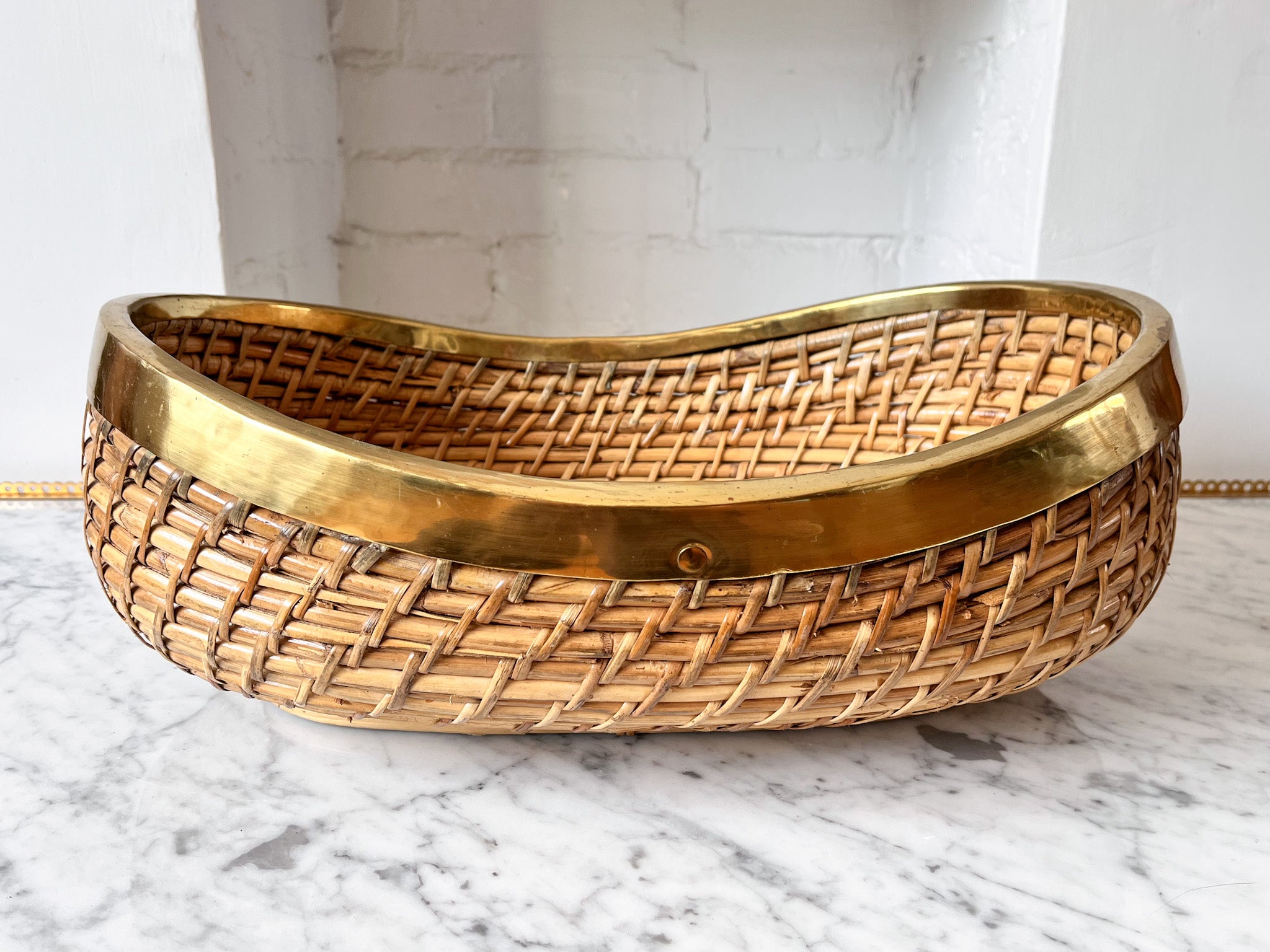 A stunning large vintage pencil reed bowl with brass trim in the manner of Gabriella Crespi. Will make a great centrepiece on a coffee table or a sideboard.