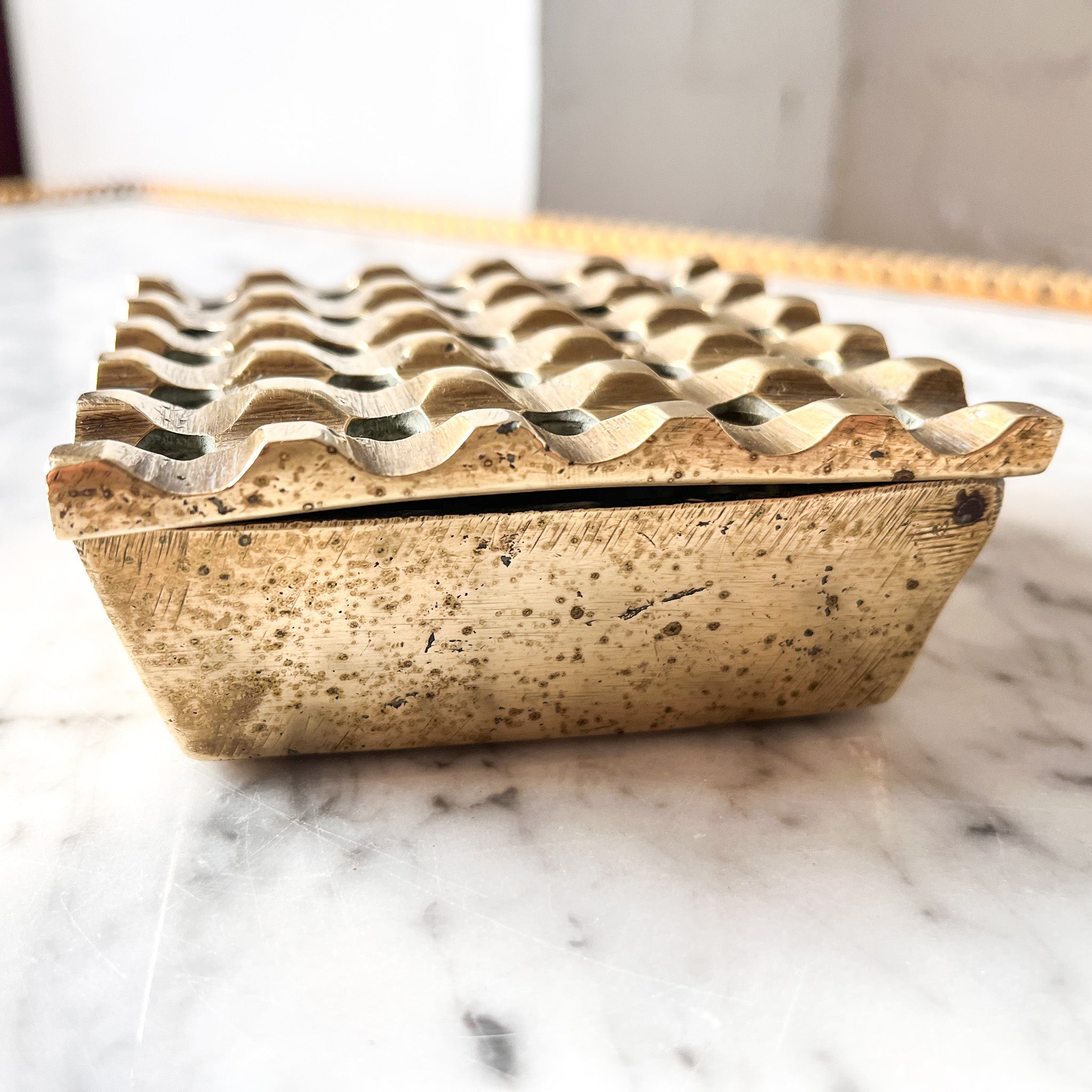 A mid-century modern ashtray / decorative trinket box in the manner of an iconic Ultima 15 design by Holger Backstrom & Bo Ljungberg. It's made of brass and features a distinctive geometric pattern.
