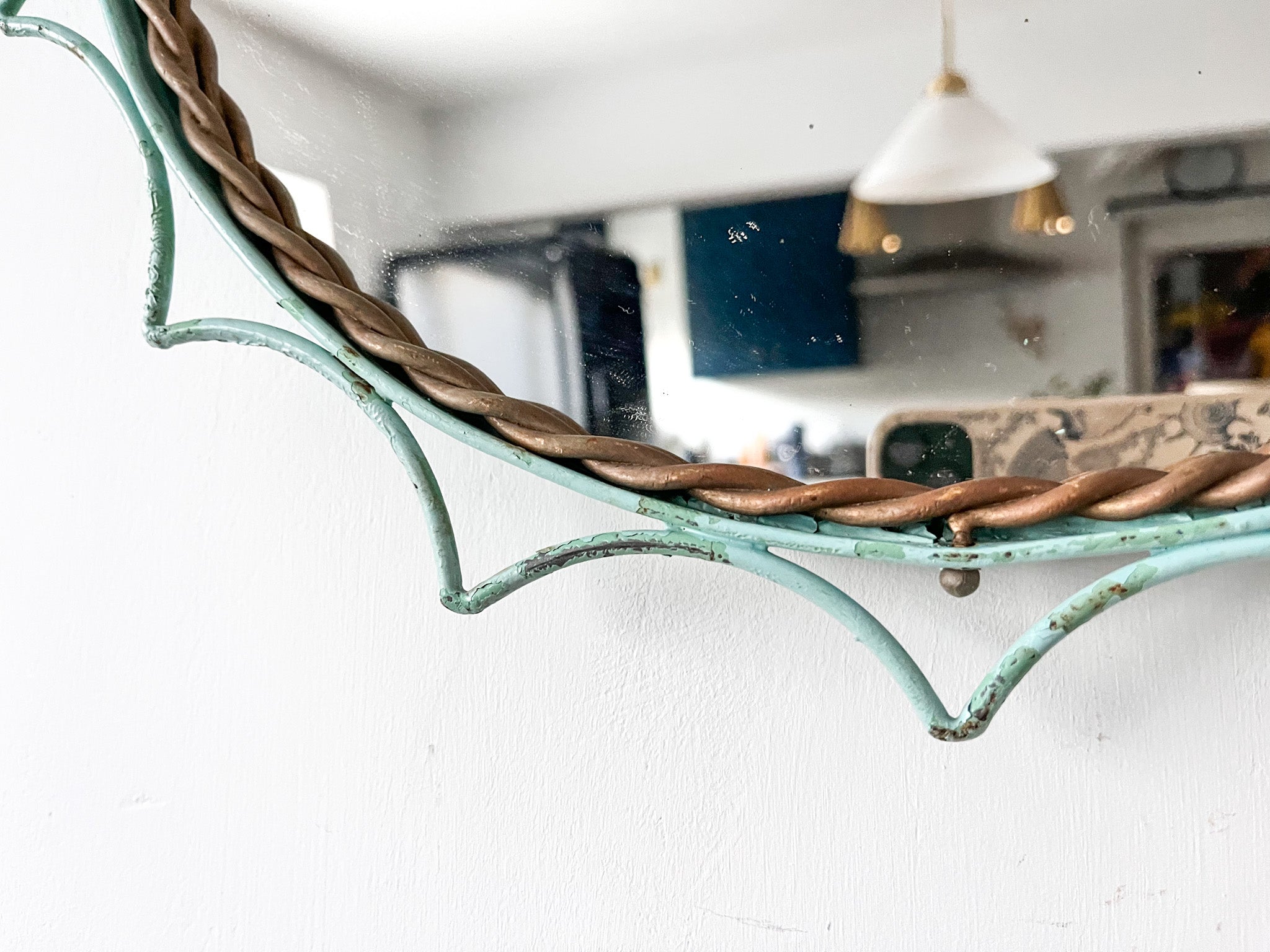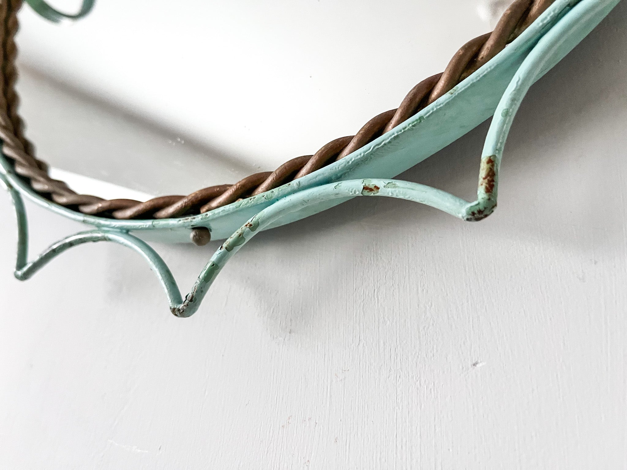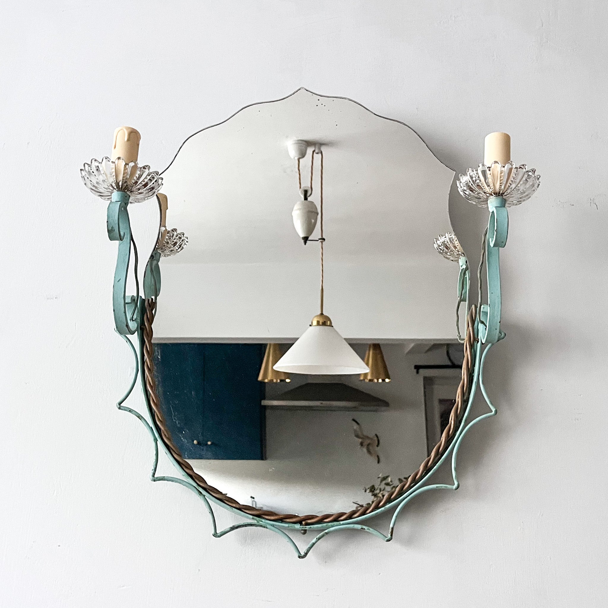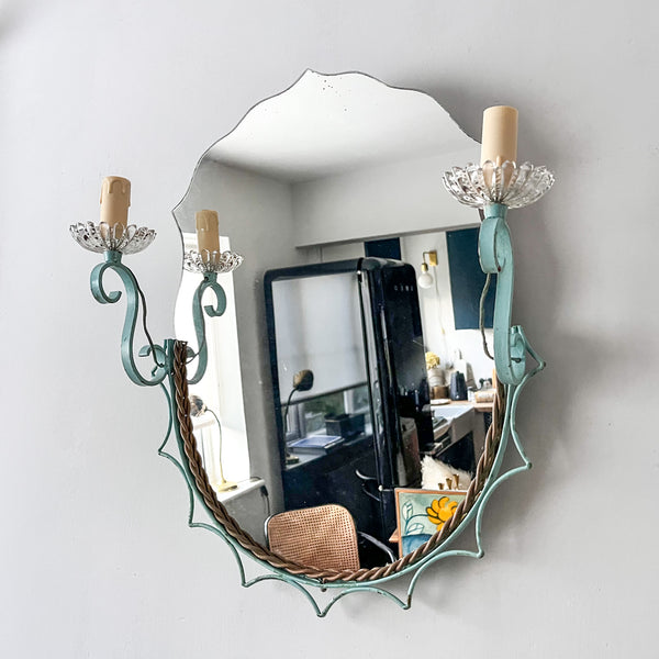 A beautiful and rather unusual French wall mirror in a blue metal painted frame with crystal light sconces (circa 1950s). They would need to be re-wired by a qualified electrician or could be used as is and perhaps adapted for candles. Would look great in a bathroom.