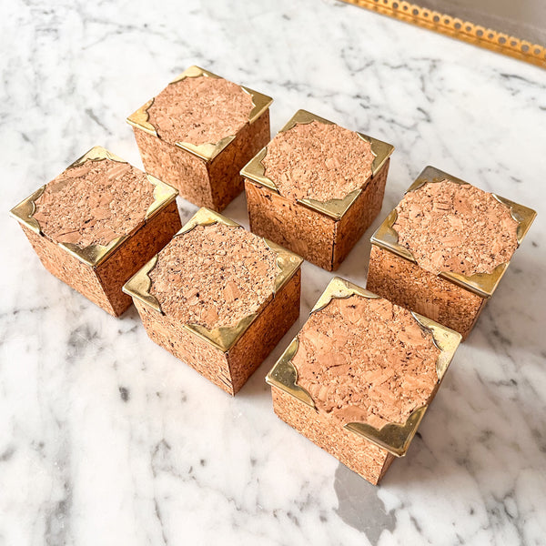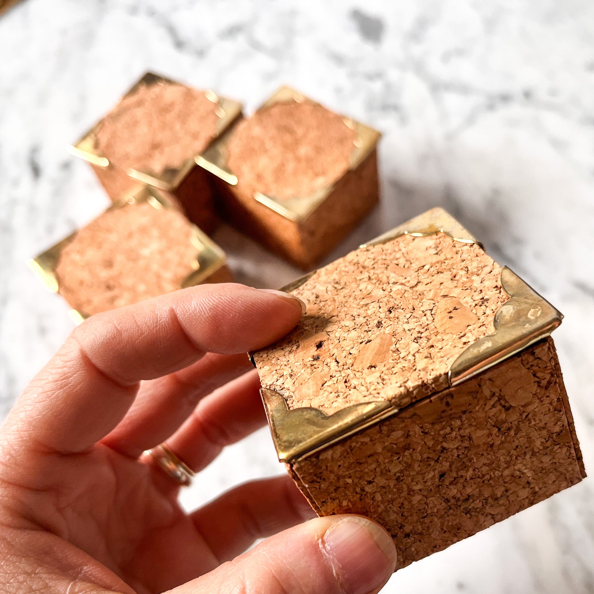 Very cute and unusual little boxes that would be perfect for keeping or gifting jewellery in the manner of Gabriella Crespi, made of cork and gilded metal with lucite inserts.