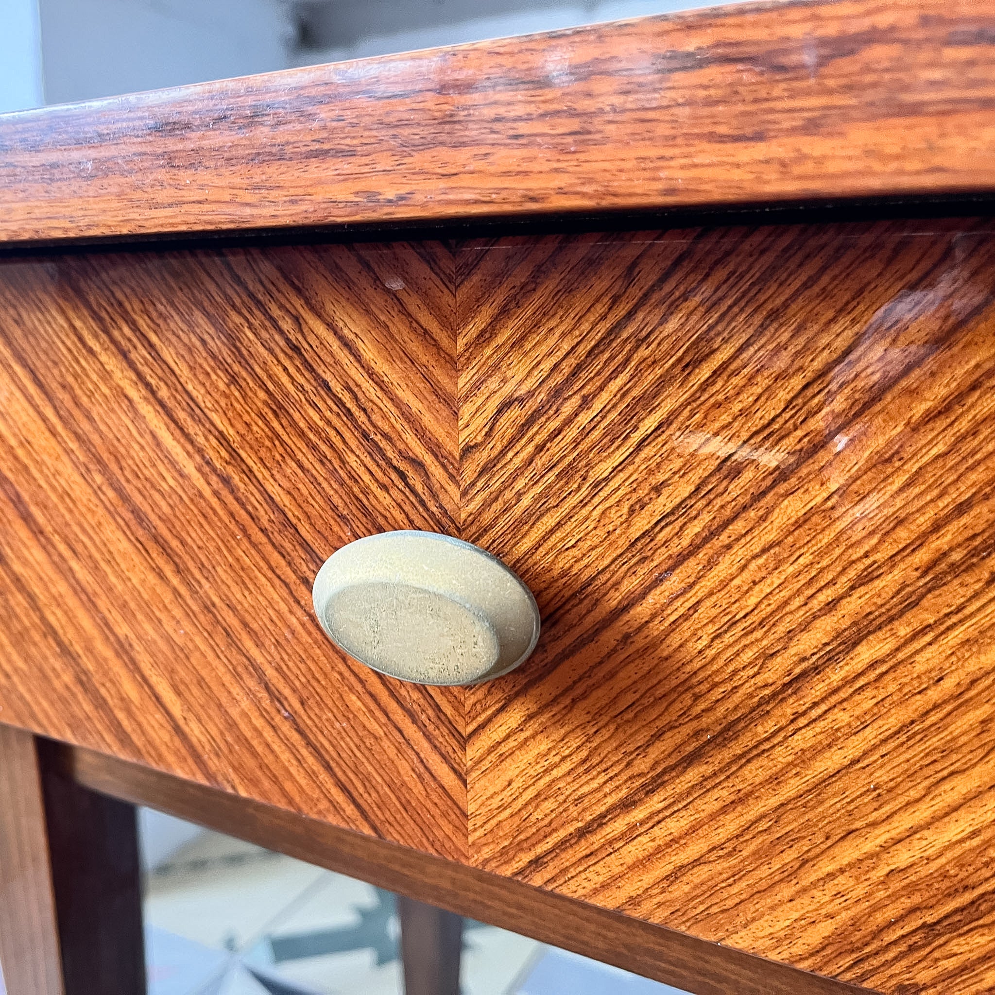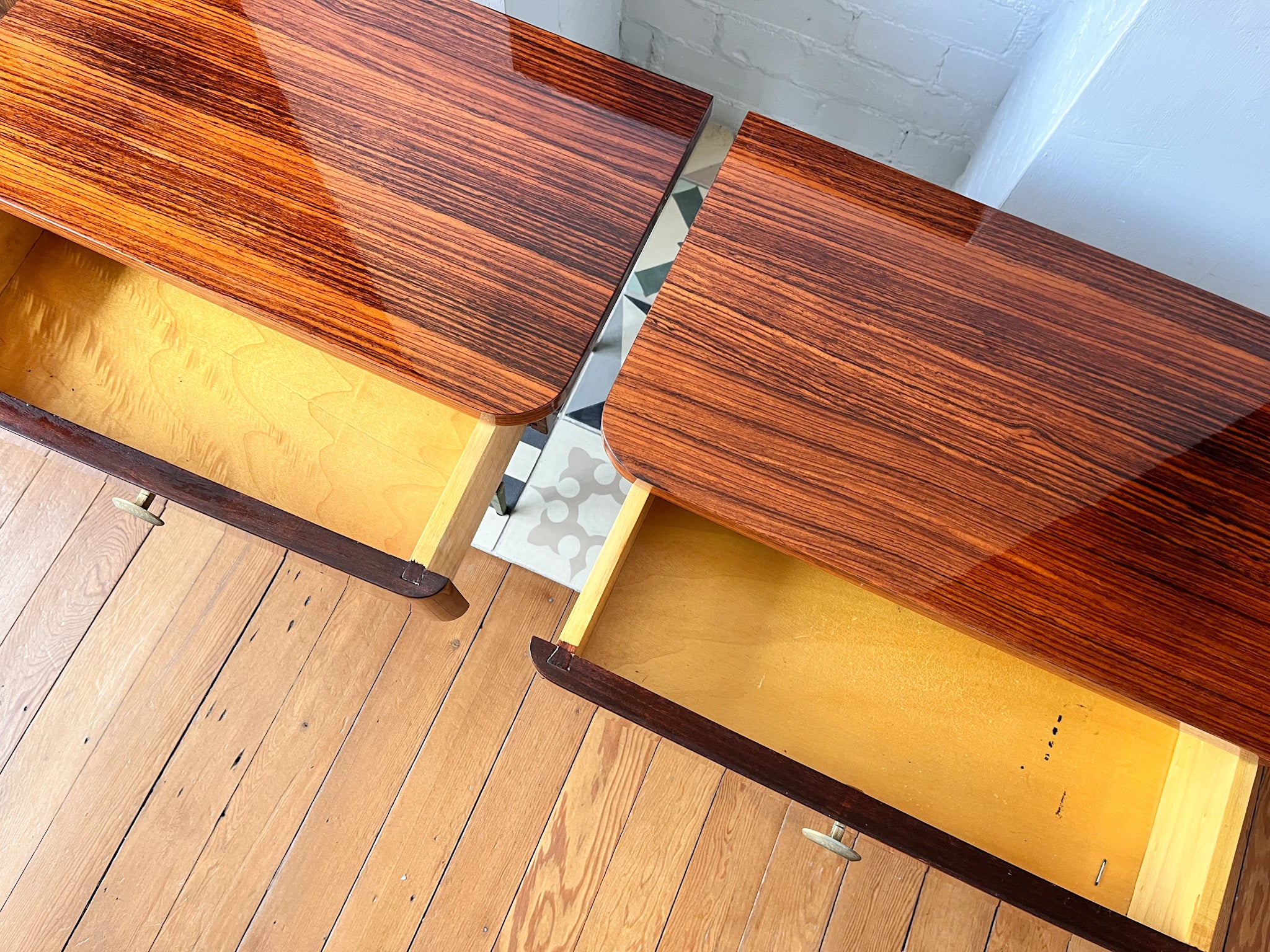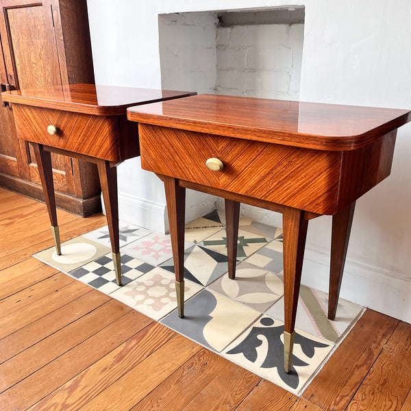 A stunning and elegant pair of 1950s French bedside cabinets in polished veneer.