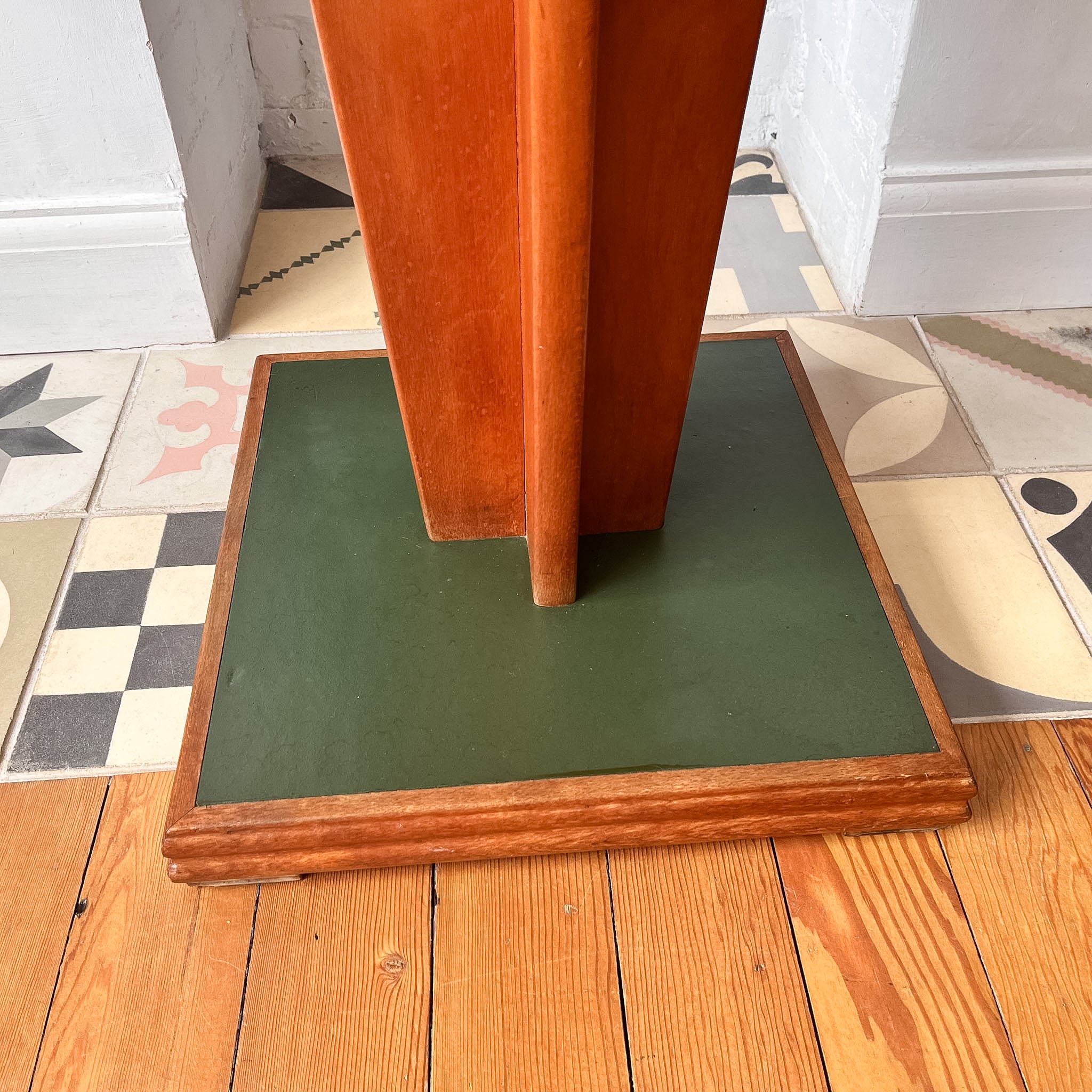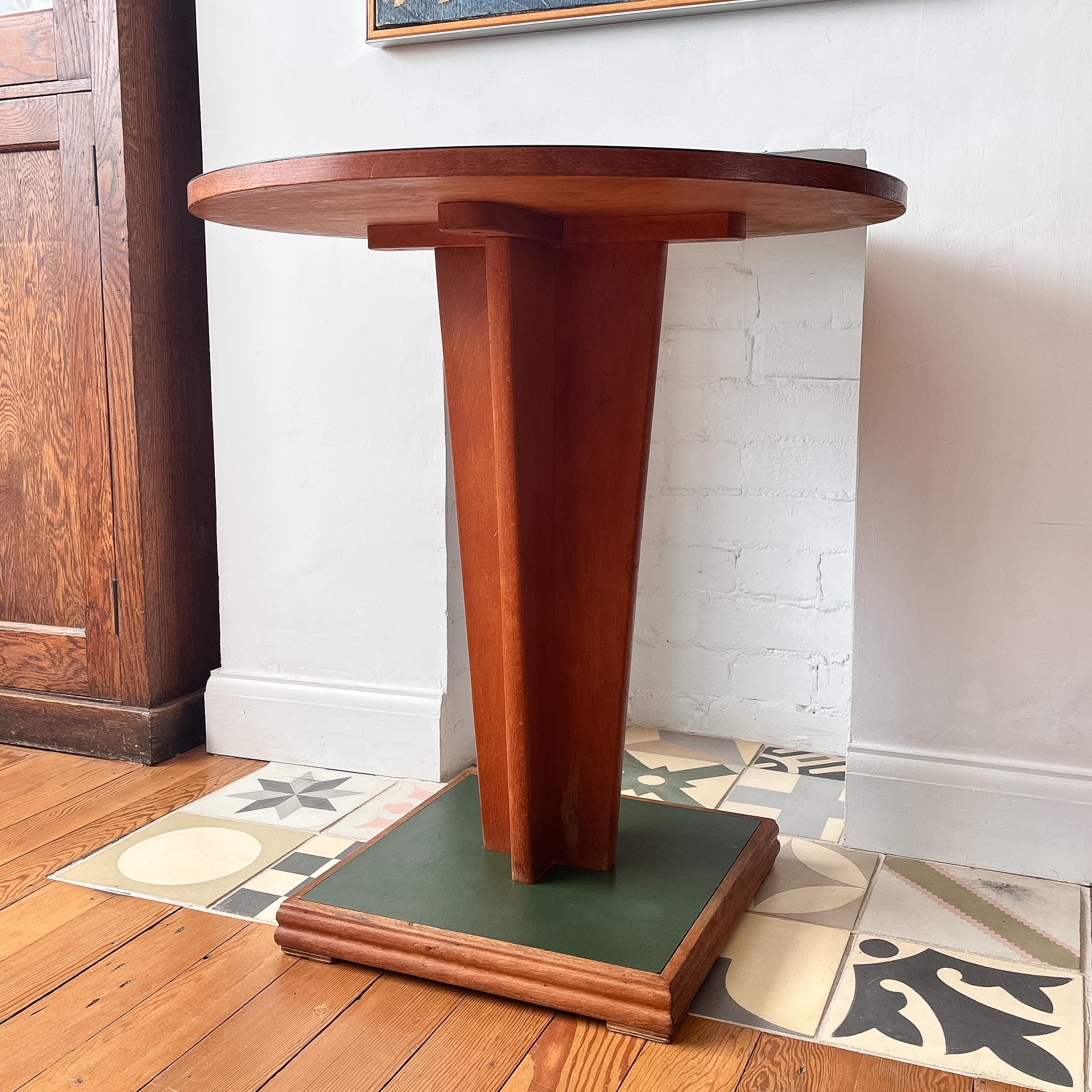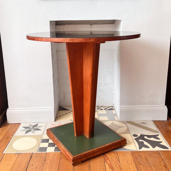A circular Art Deco pedestal table in the manner of Charles Ramos with a black formica top and a cruciform base resting on a green base standing on four small feet.
