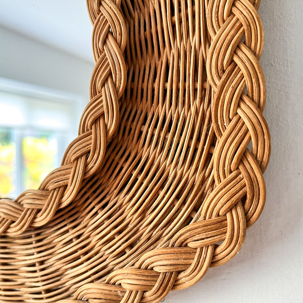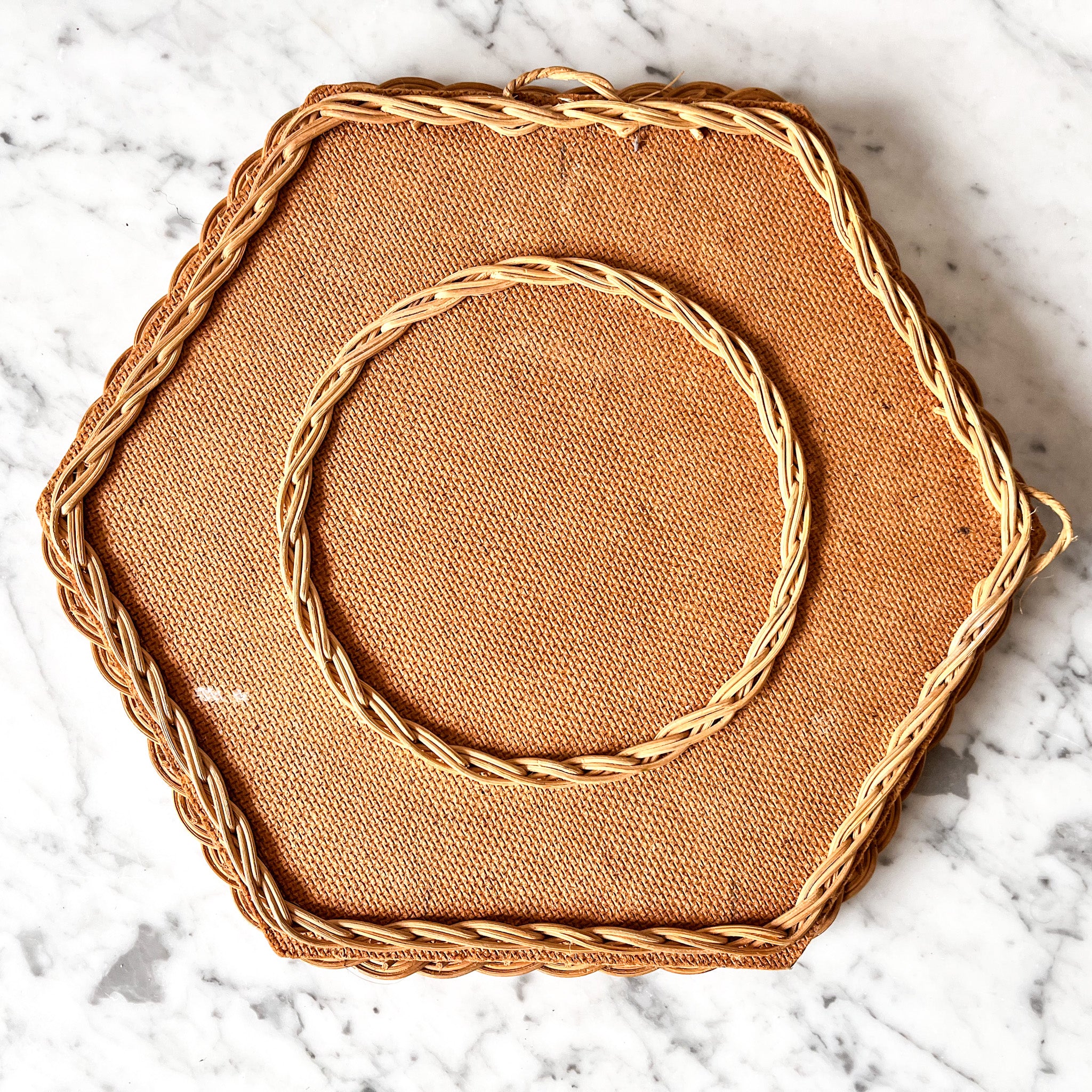 A lovely small French vintage hexagonal wicker wall mirror. Can be hung two ways.