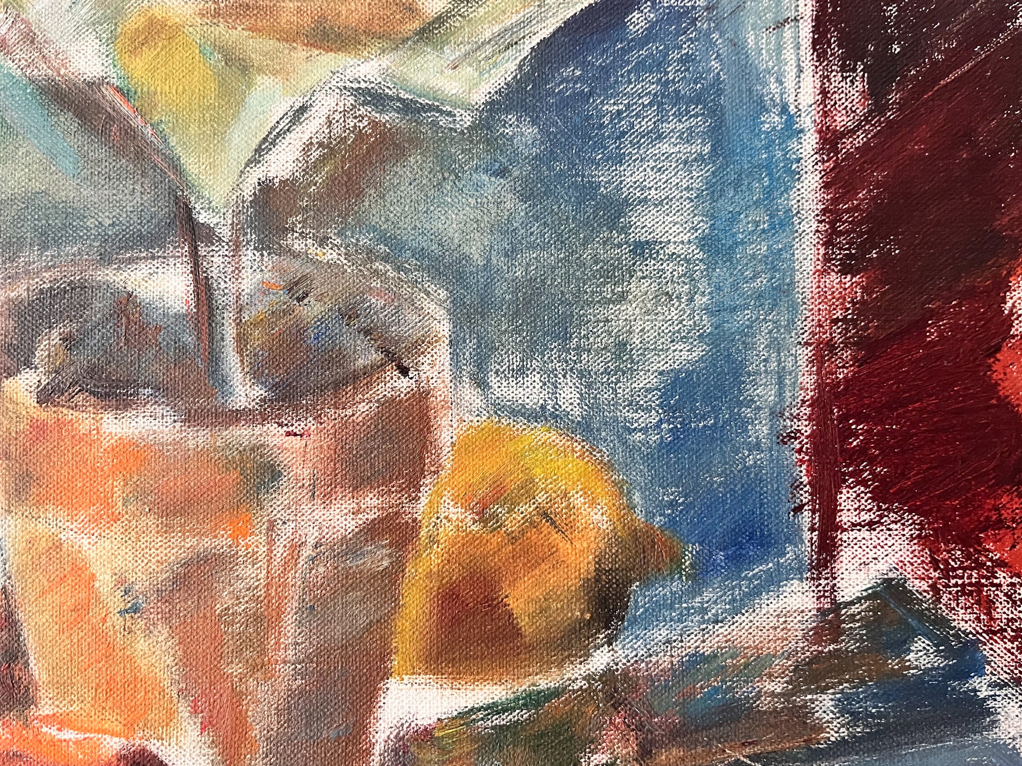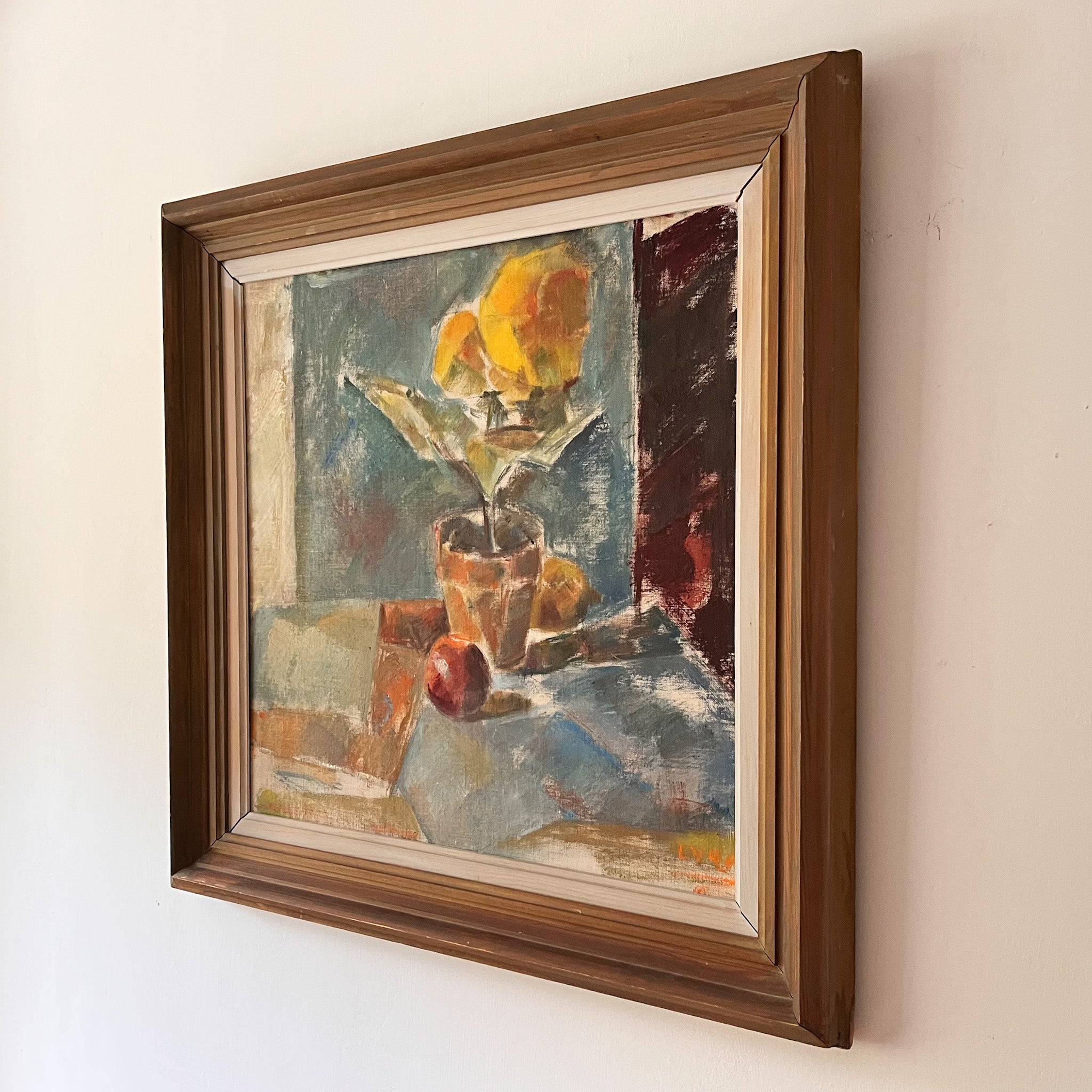 A beautiful oil on board still life of a yellow flower with fruit. By Lars Vidlund, signed by the artist.