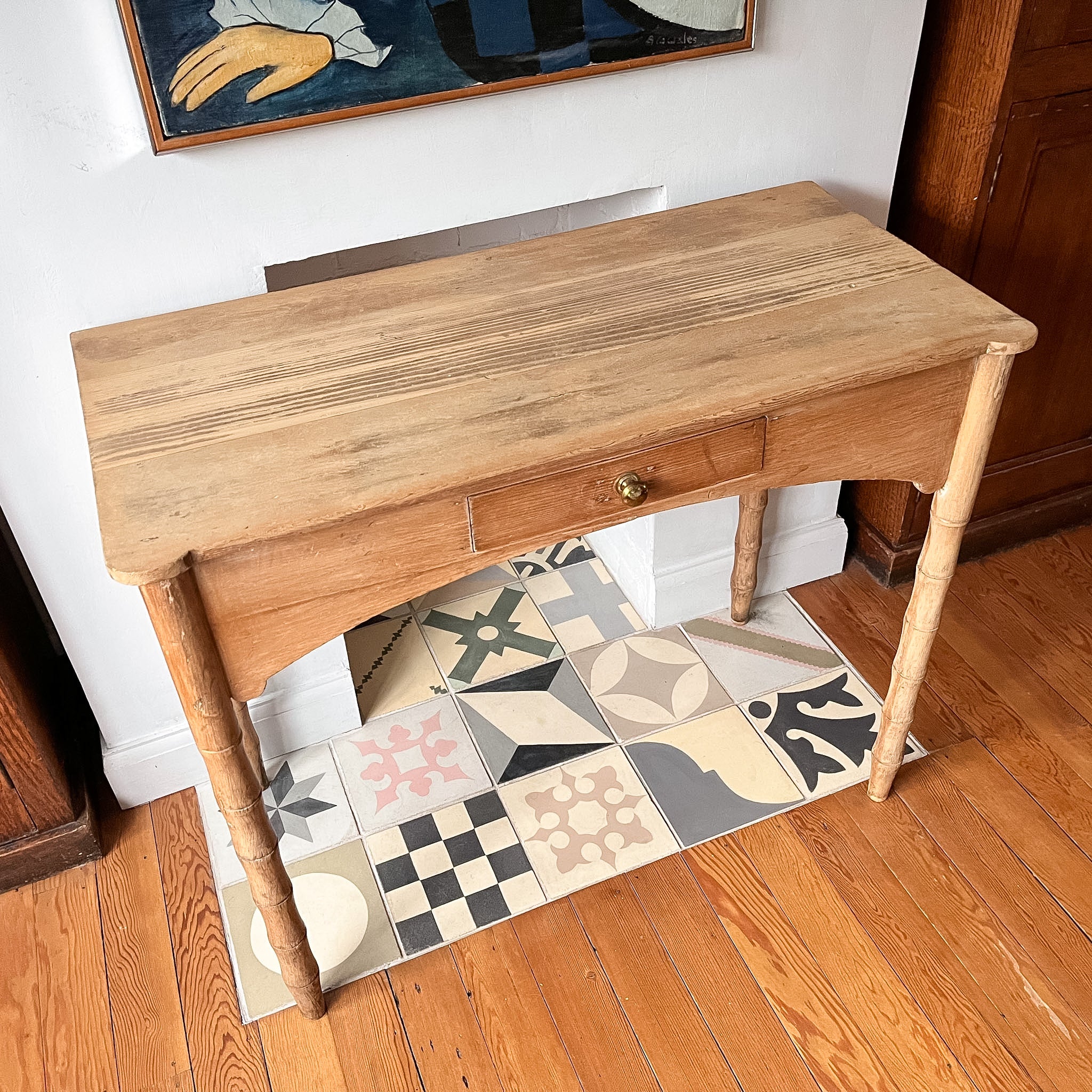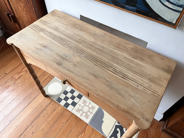 A beautiful rustic Victorian pine table with faux bamboo legs and a drawer with a brass handle. A charming and hard to come by piece, that will be perfect as a hall table or console thanks to its relatively shallow depth. If wished it can even be turned into a desk.