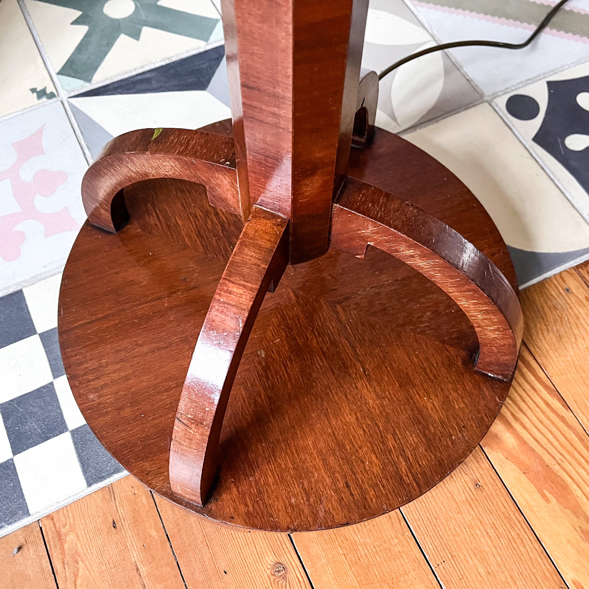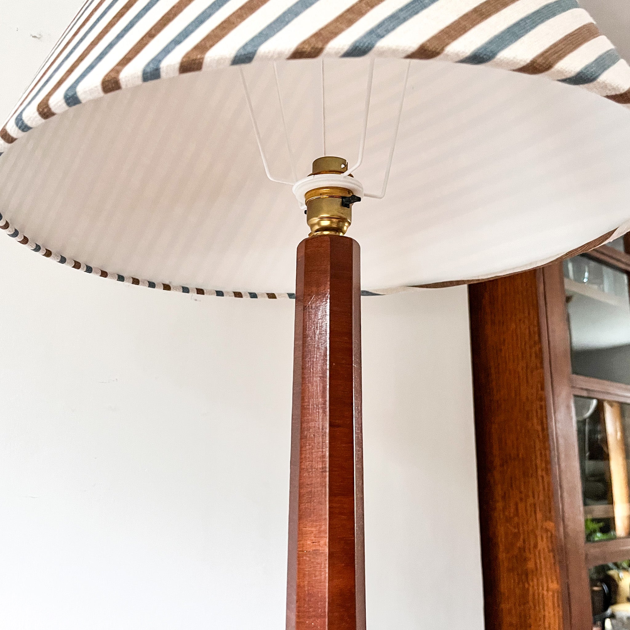 A stunning tall walnut veneered Art Deco standard lamp with a hexagonal tapered column.