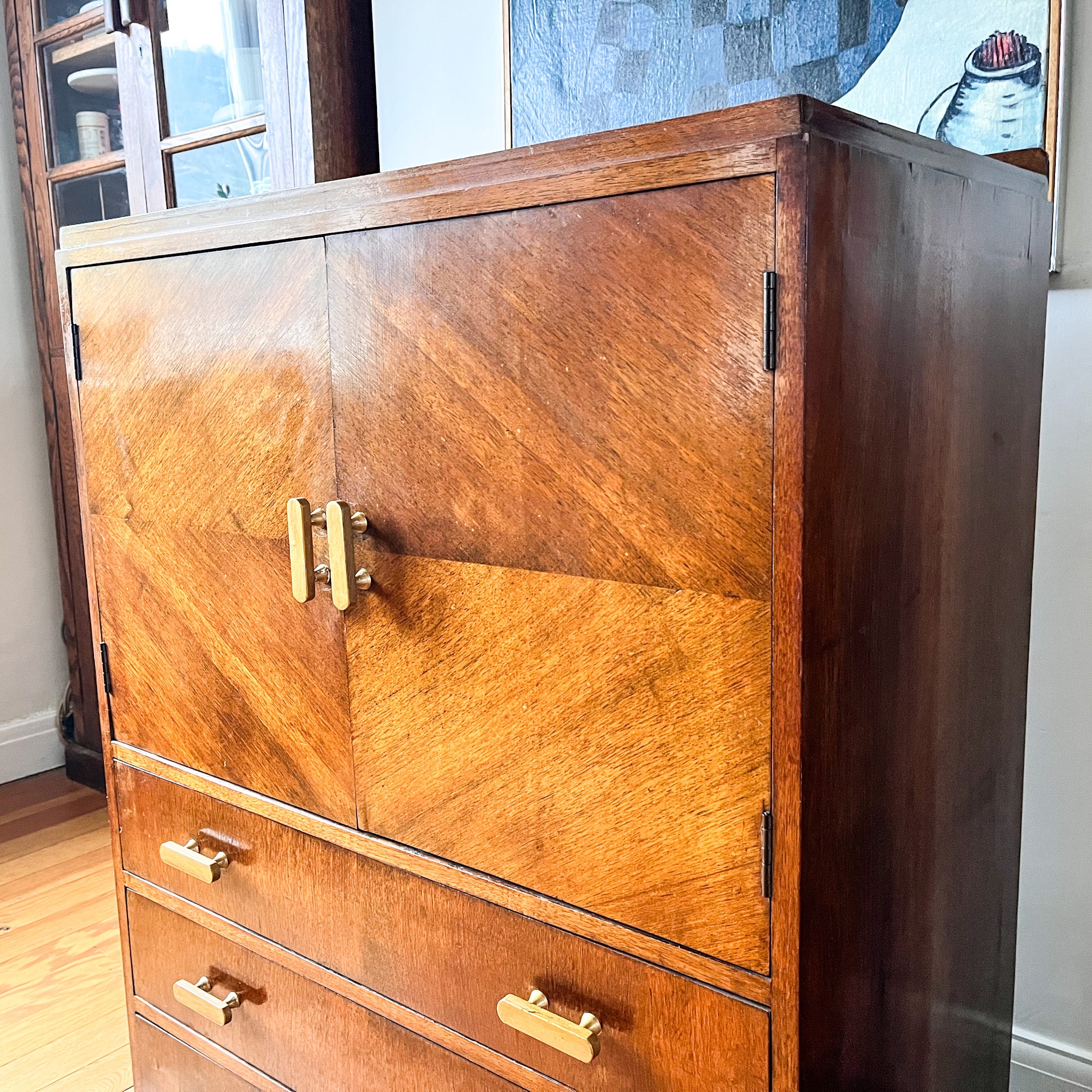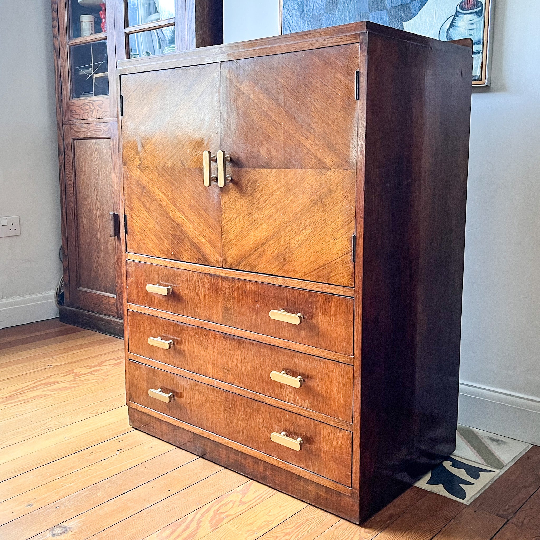 A beautiful Art Deco parquetry cabinet with two triangular veneered doors and three drawers below. It will look great in an alcove or will be perfect for a bedroom.