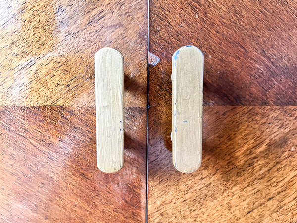 Good vintage condition. The veneer has some small cracks on the top and a couple of small knocks around the edge and a couple of small losses. One of the door has slightly warped and comes forward slightly which can be noted in the gap between the doors around the handles. It doesn't detract from the looks in my opinion. Please see close up photos for details.