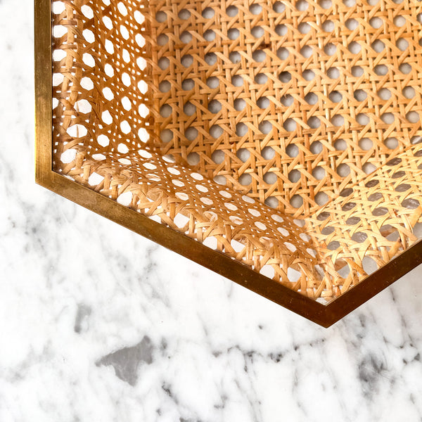 A classic vintage Christian Dior Home Collection lucite, rattan and brass centrepiece bowl.