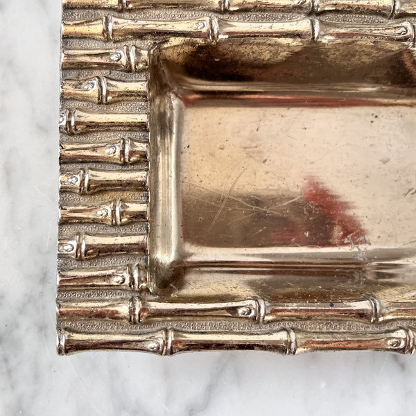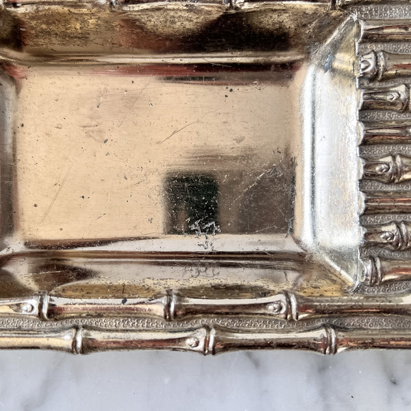 A beautiful little metal dish decorated with faux bamboo pattern. Will look great on a coffee table, bedside or in a bathroom.