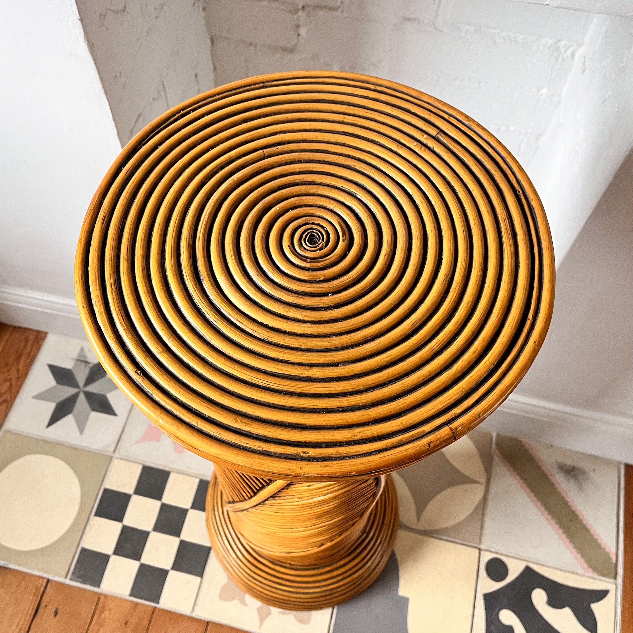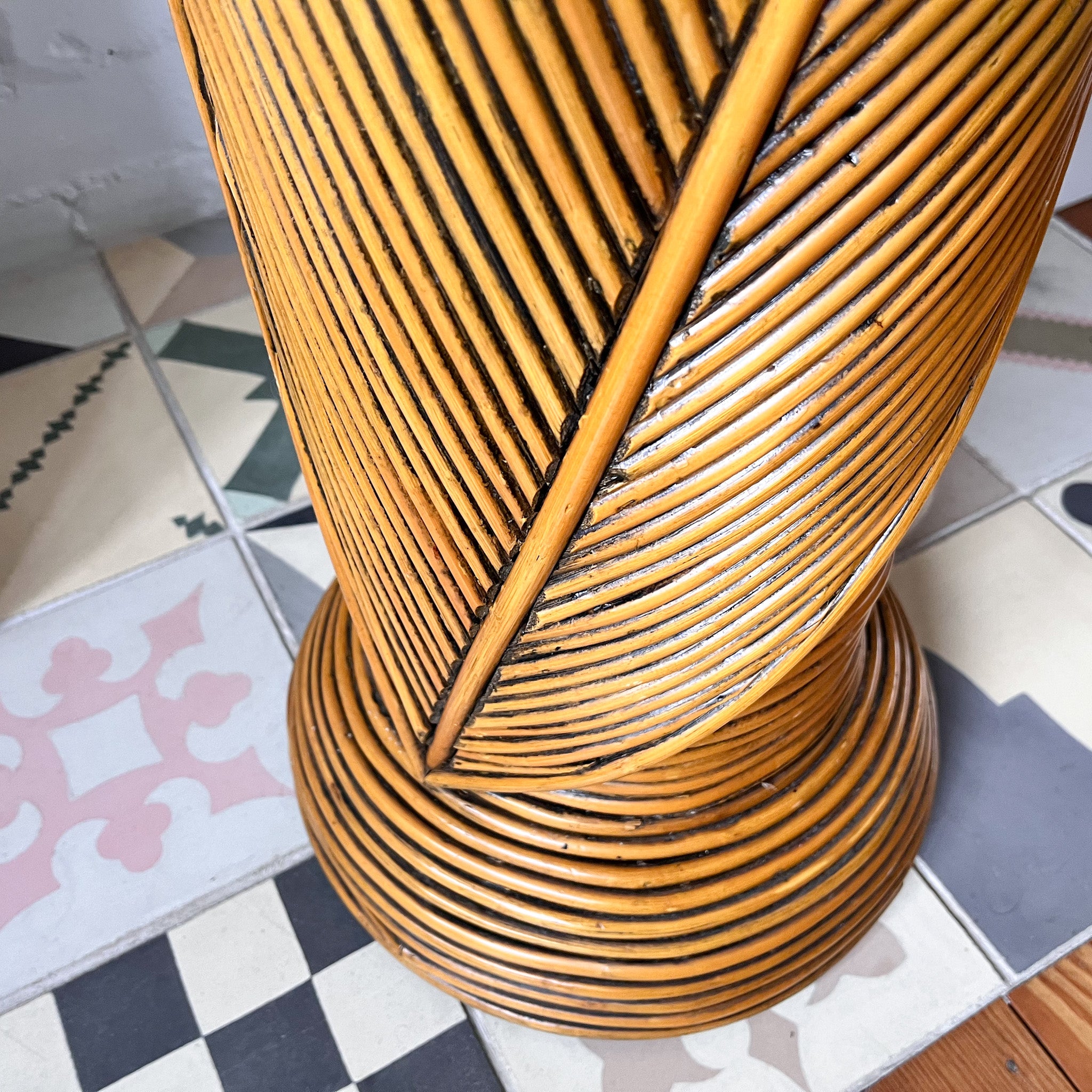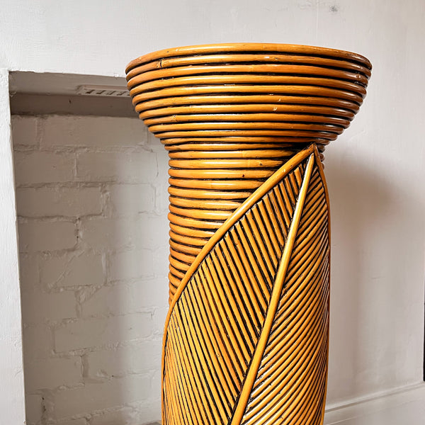 A beautiful vintage pencil reed pedestal with a leaf detail. It will make a great decorative piece with a plant or ceramics or sculpture on top.