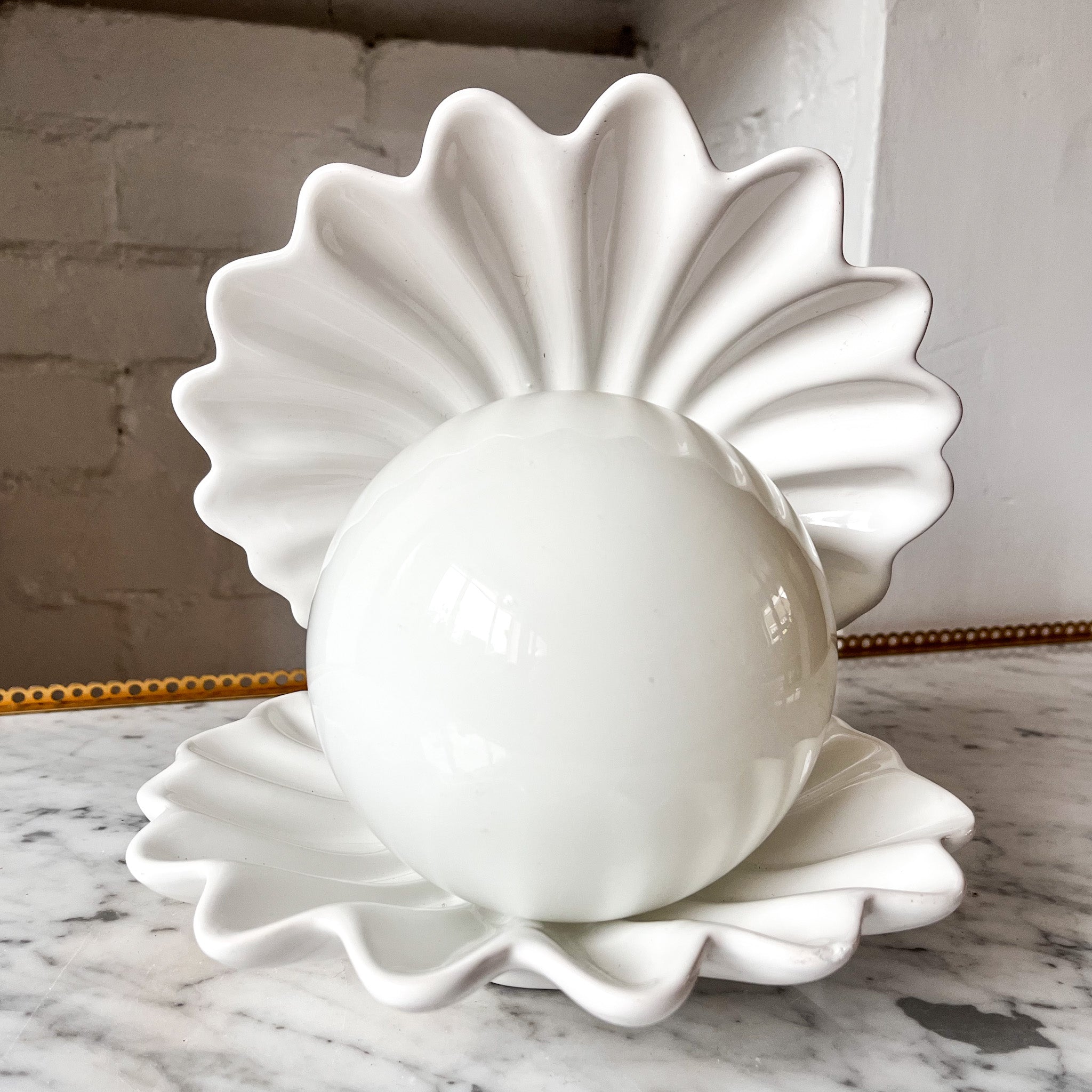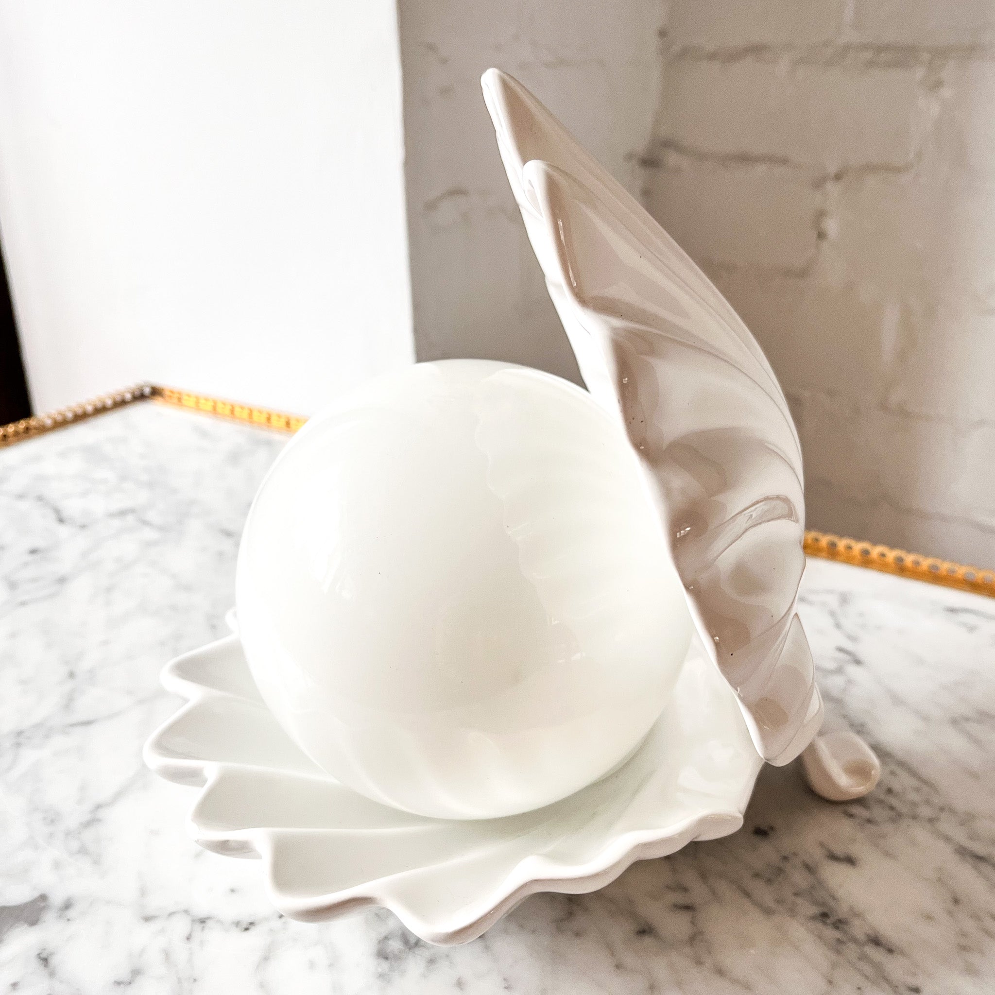 A stunning vintage ceramic lamp in the shape of a clam shell. It will look amazing on a night stand in a bedroom.